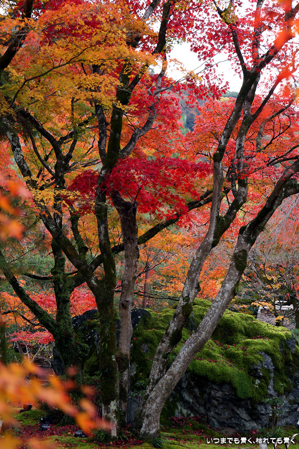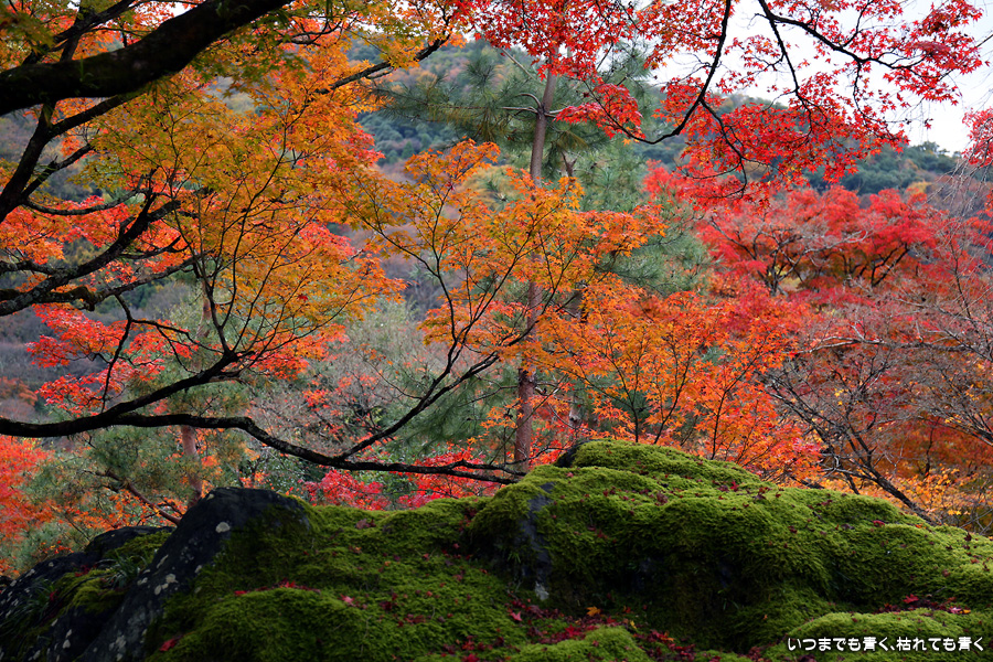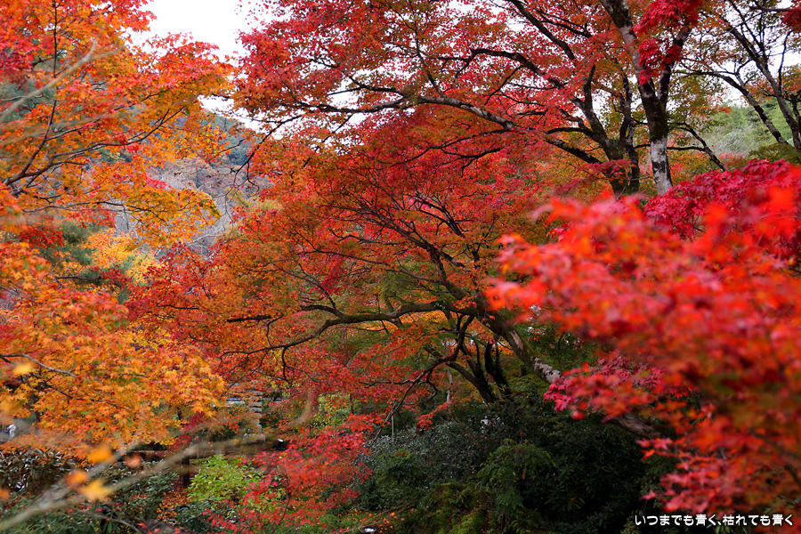 宝厳院は2年ぶりの拝観です。2年前に訪れた時も11月24日と同じ日でしたが、かなり葉を落としていた2年前に比べると今年はまだたくさんの葉を枝に残しており、壮観な紅葉を見ることができました。ただ、訪れた時刻も2年前と同じ14時半頃で、この時刻になると宝厳院は太陽の光が山で遮られて写真撮影にはちょっと厳しい状況でした。宝厳院は渡月橋にも近い紅葉名所なので、人が多いのも写真撮影には根気と割り切りが必要な場所です。