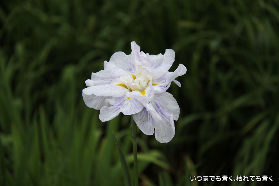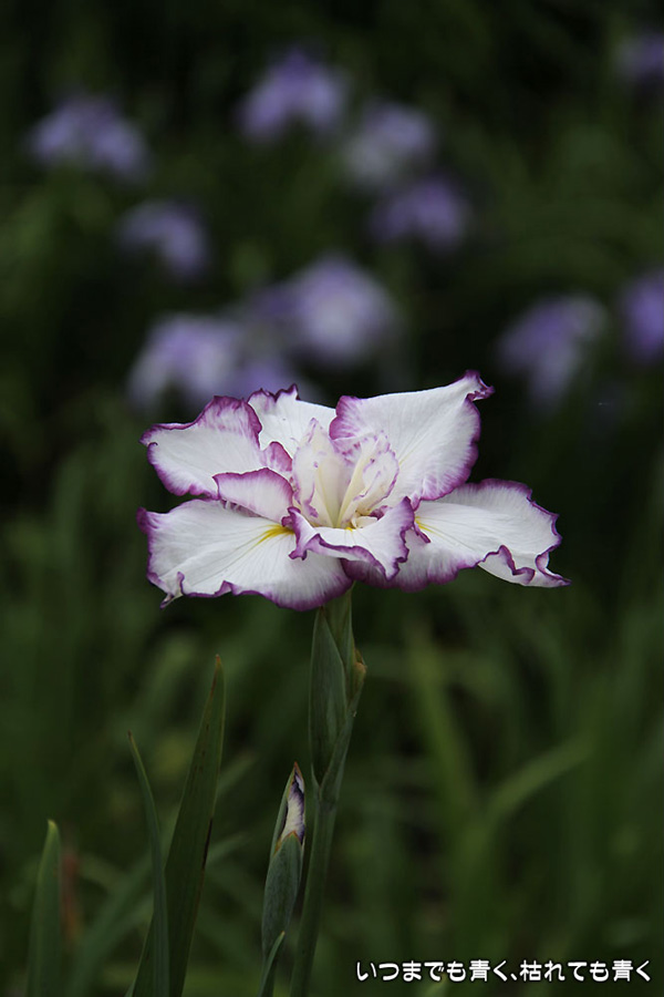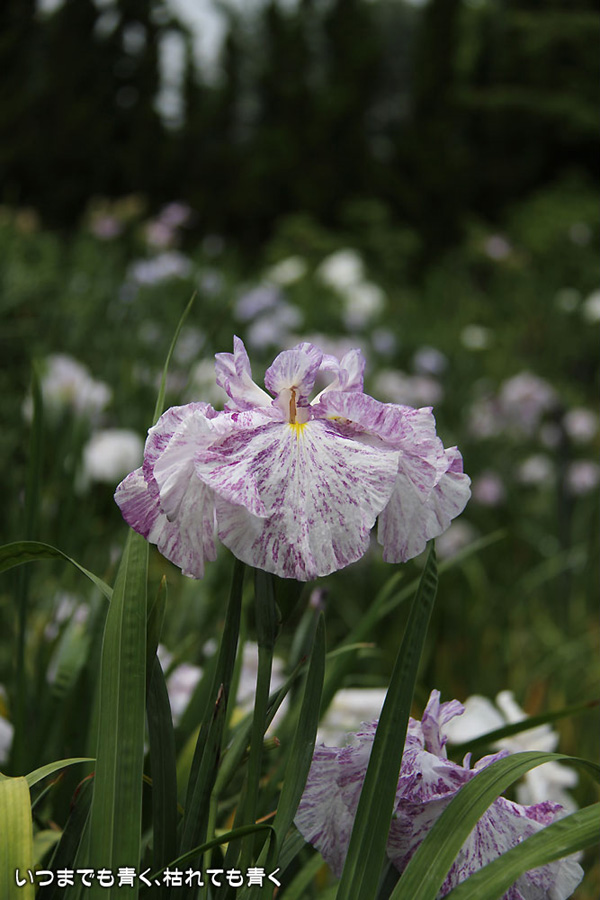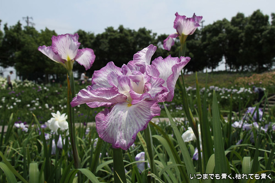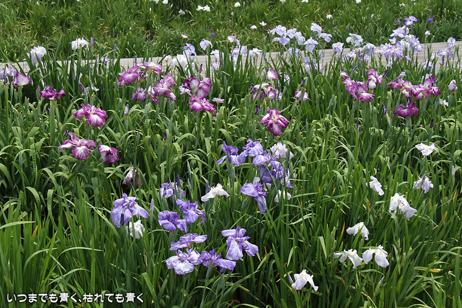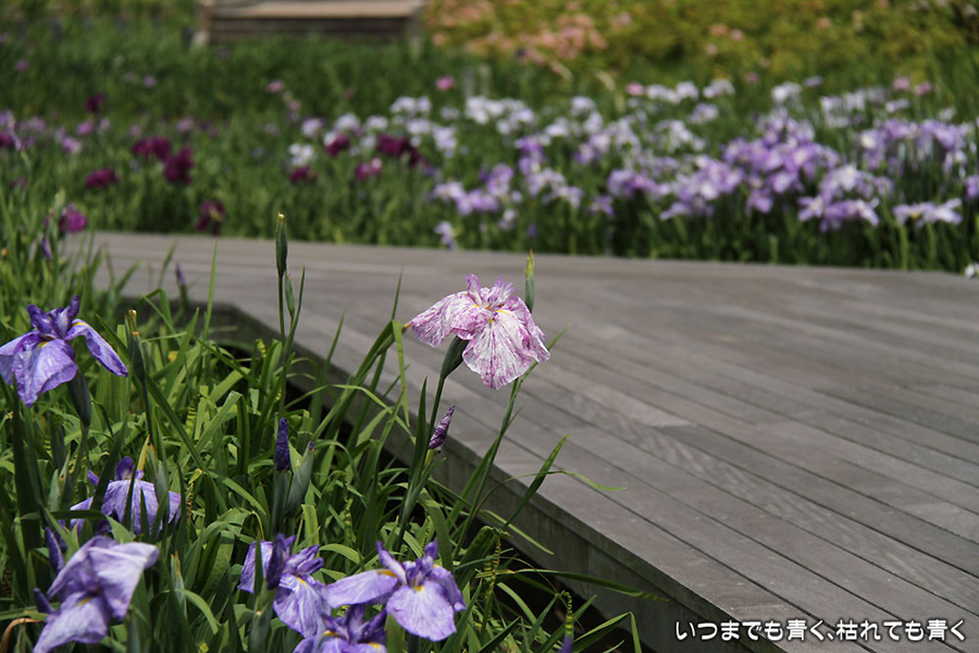 7月8日までは「あじさい・花しょうぶまつり」ということになっていましたが、紫陽花はもう時期が過ぎていました。しかも、花壇に植えられた紫陽花というのは、風情がなくてダメでした。紫陽花という花は、寺社などの庭が似合うような気がします。そのかわりに楽しんできたのが、花菖蒲。花菖蒲は、たくさんの数と種類が植えられていて、のんびりと眺めて楽しむことができました。花菖蒲も、紫陽花の花壇に囲まれた場所に植えられていて、周りの風景との調和を楽しむという風情はありませんが、数が多いので花菖蒲同士で構図をとって写真を楽しむということはできました。構図決めはなかなか難しいですが。相変わらず、ありきたりの構図の写真ですが、花菖蒲苑の雰囲気を残しておければと思います。