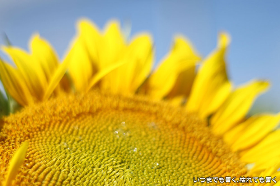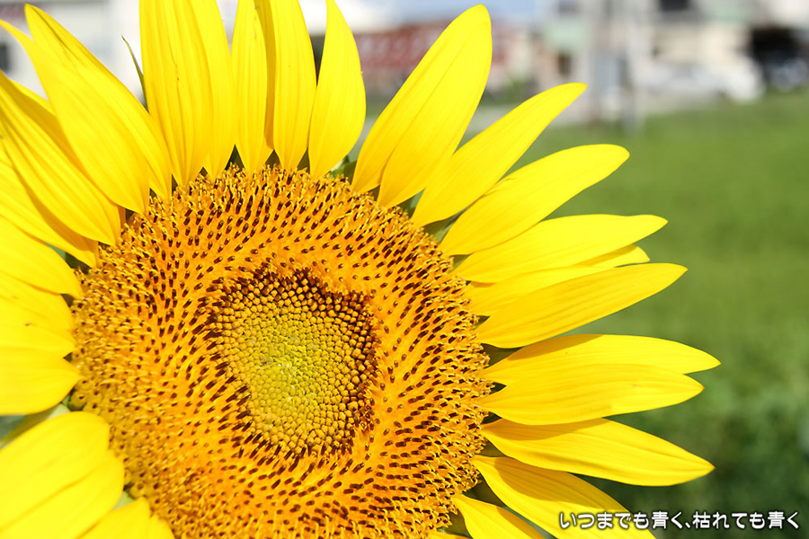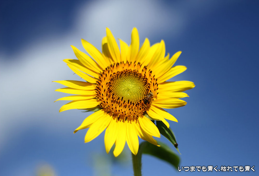 自分で運転していると気づきにくいのですが、先週、バスに乗って窓の外を眺めていて、家の近くの休耕地に向日葵(ひまわり)畑があることを知りましたので、今日、カメラを持って出かけてきました。そのあたりの休耕地は、農林水産省の農地・水・環境保全向上対策として、景観植物が植えてある場所です。以前に秋桜(コスモス)を撮りに来たことはあるのですが、向日葵が植えられているのは、初めて知りました。向日葵畑の隣の土地には秋桜の看板がありますので、もう少ししたら秋桜もまた楽しめるようです。向日葵は少し小ぶりの向日葵でしたが、これから咲こうとするものもあって、今が見頃とばかりに元気に美しく咲いていました。向日葵にはたくさんのミツバチが集まってきていて、一生懸命に花粉を集めているのが可愛らしかったです。周辺は住宅や電線があったりで、撮影に適した土地とは言い難いですが、夏が終わってから(残暑は厳しいですが・・・)向日葵畑に出会えるとは思っていませんでした。忘れた夏を取り戻したような感覚でした。