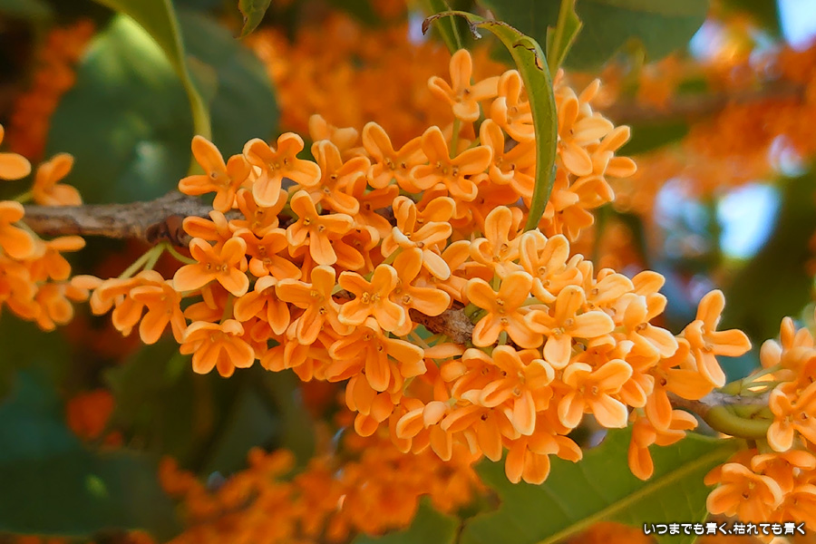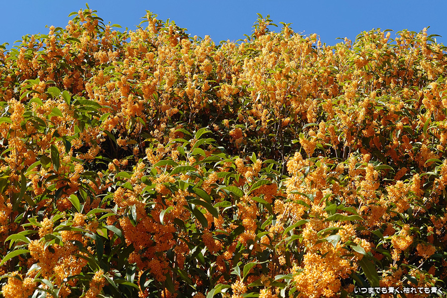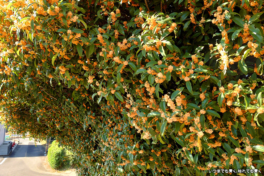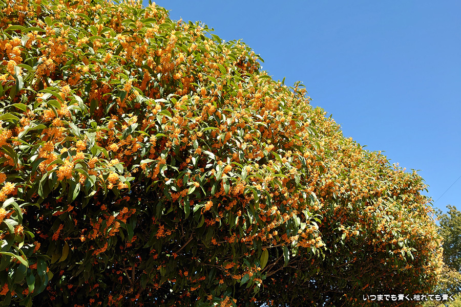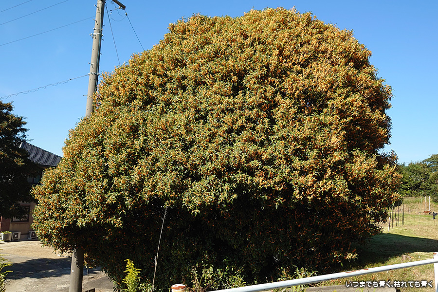 キンモクセイ好きの娘と車で走っていた時に見つけたキンモクセイの大きな木です。こんな大きな木は今まで見たことがありません。特に横幅の大きさに驚きました。道路沿いだったので、クルマを止めて娘と写真を撮らせていただきました。一眼レフカメラは持っていなかったので、スマホで撮影した写真です。