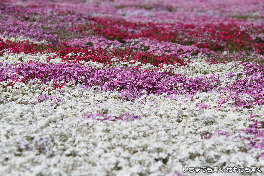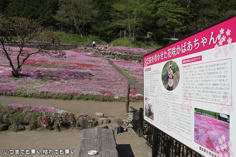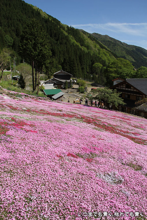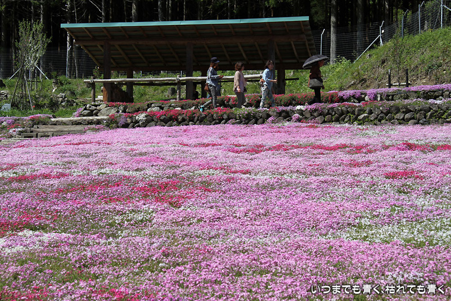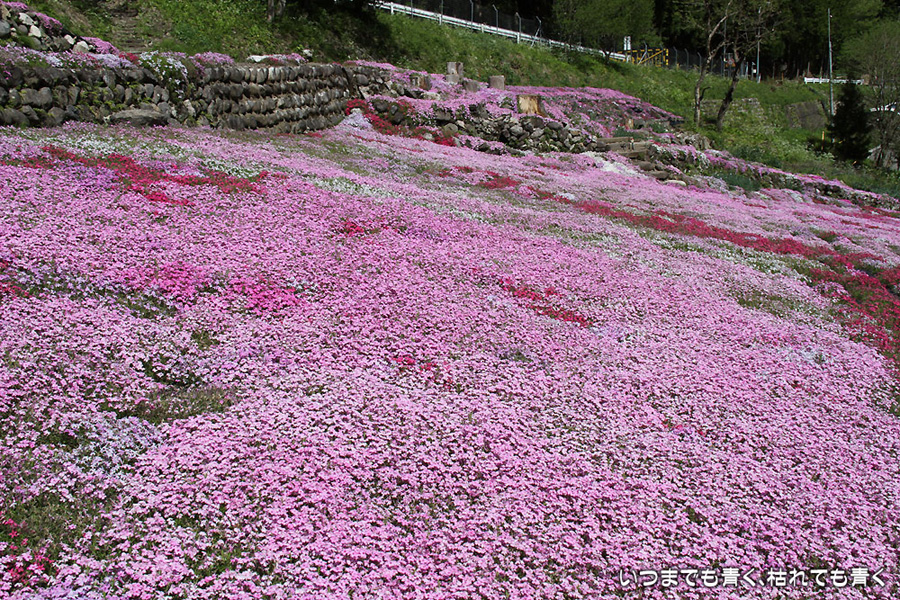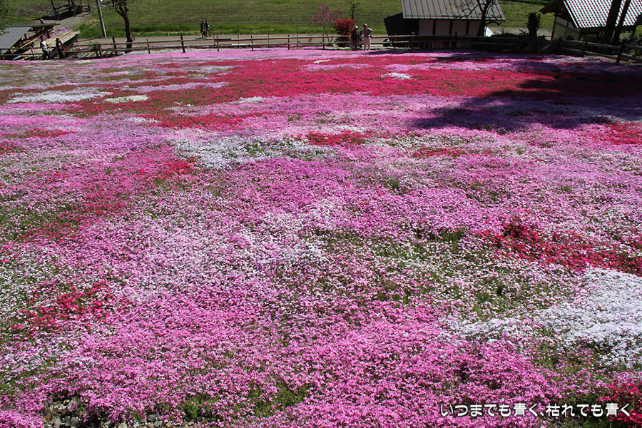 今日は昨日の雨が嘘のように暖かな快晴となりましたので、どうしても見ておきたくなった岐阜県郡上市の國田家の芝桜を見に行ってきました。見頃は4月末からゴールデンウィーク中だということでしたので、ひょっとしたらもう鑑賞に値しないかもと思って出かけましたが、まだピンクや赤の絨毯を充分楽むことができました。4月末だと、満開の芝桜と、桜、水仙、チューリップとの競演も見られて、一層華やかで美しいので、来年は見頃の時期に絶対に見に行こうと思います。國田のおばあちゃん(故人)の意思が、地域の方と見学者の募金でいつまでも引き継がれていくことを願います。