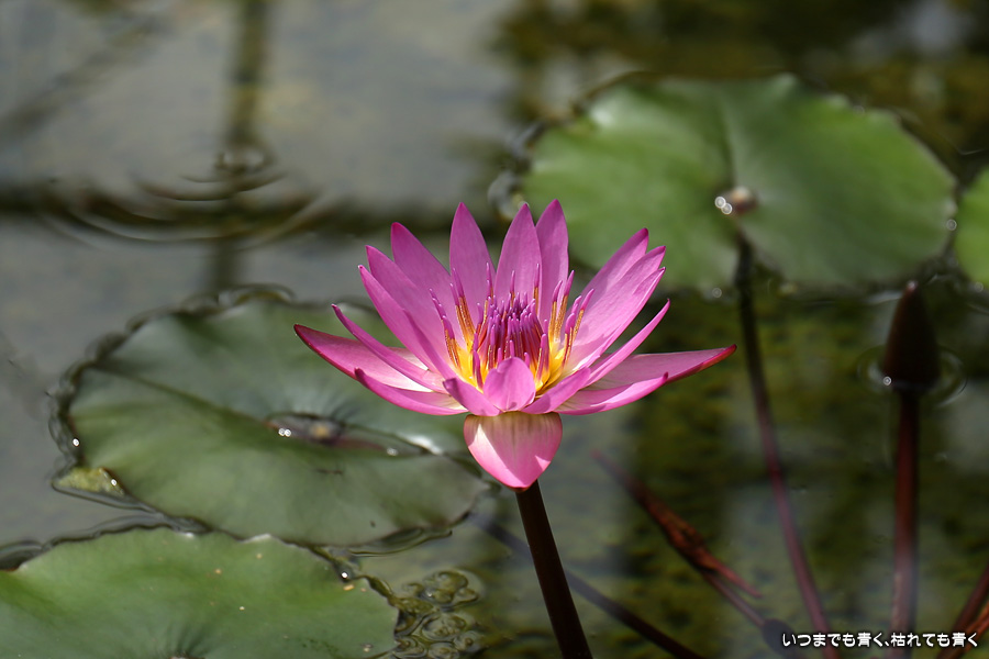 秋の西山公園を散策してきた時に撮影した睡蓮の写真です。ハウスの中の池に可愛らしく咲いていました。睡蓮は別名「ヒツジグサ:未草」とも言います。蓮と混同されることもありますが、蓮は葉を水の上に立ち上がらせていますが、睡蓮は葉が水に浮いていることで区別できます。また蓮はレンコンから立ち上がっていますが、睡蓮は球根から立ち上がっています。