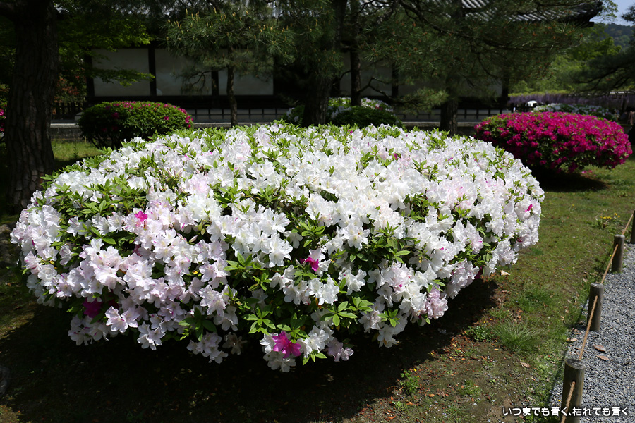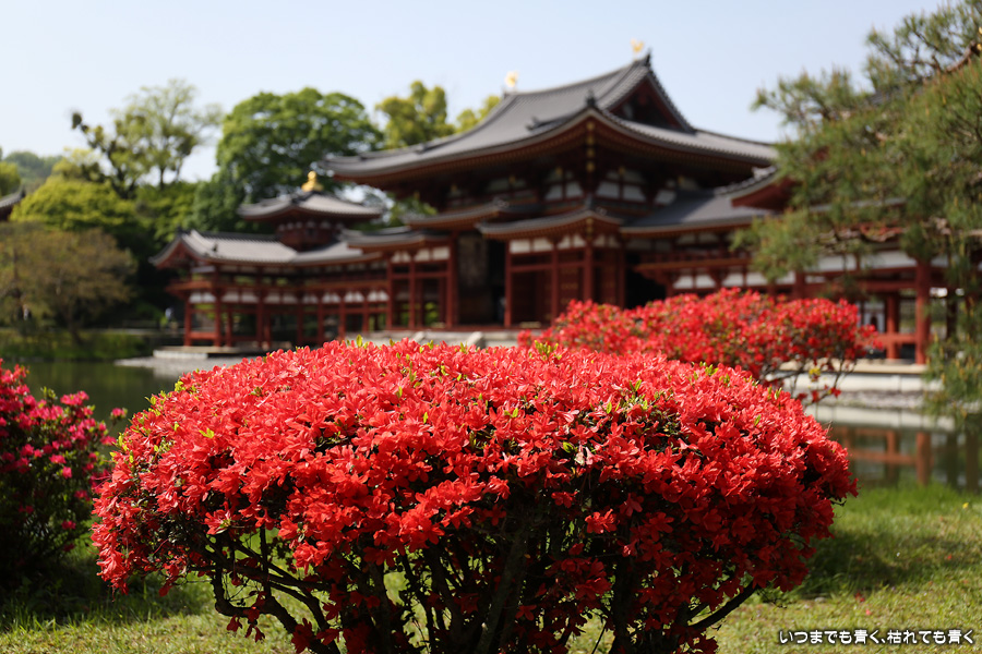 平等院のツツジは、阿宇池の北側にキリシマツツジ、観音堂の横にヒラドツツジがあります。藤棚のほうが人気ですが、ツツジも平等院ならではの構図で楽しめます。