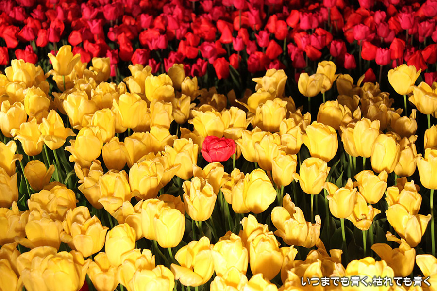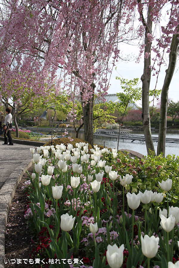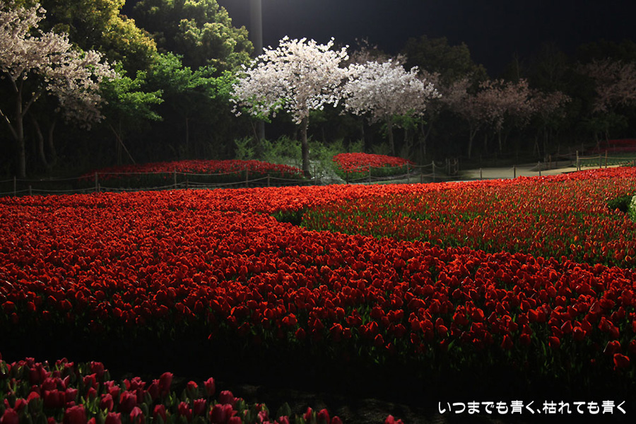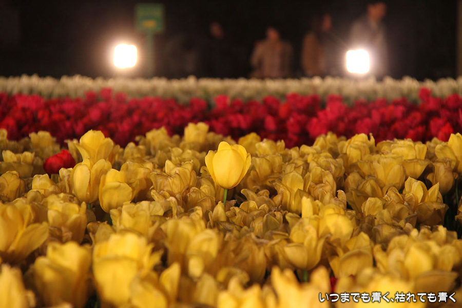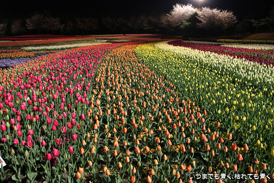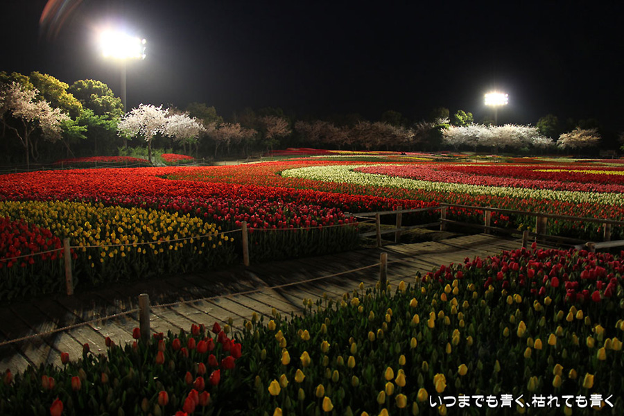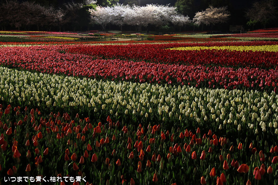 盛大に咲き誇るチューリップを見たくて、「なばなの里」に奥さんと長女と3人で行ってきました。「チューリップまつり」の会場のチューリップは、昨日の「奥殿陣屋」のチューリップとは桁違いで、圧倒されるほどの広さと数と種類です。案内によると、190品種、180万球のチューリップが植えられているとのことです。桜がまだ残っていましたので、桜とチューリップの競演ということで一緒に写真を何枚か撮ったのですが、主役である桜とチューリップを対等の配置で撮った写真は、どちらつかず中途半端な写真になってしまいました。主役級を一緒に写真に撮る場合には、どちらを主役で脇役かを決めた構図でないとダメだなぁということを勉強しました。また、これだけチューリップの数が多いと、どう何を撮れば面白い写真になるのか全然わからずじまいで、なんともセンスのない私です。どちらかというと、長女の写真のほうが構図的には面白いものが多かったりするのです。ちょっと悔しい気もしますが、ちょっと長女を見直したりもしています。掲載写真は、昼間とライトアップされた夜の写真があります。また、Page2の最後の10枚は「チューリップまつり」会場外の園内のチューリップの写真です。
