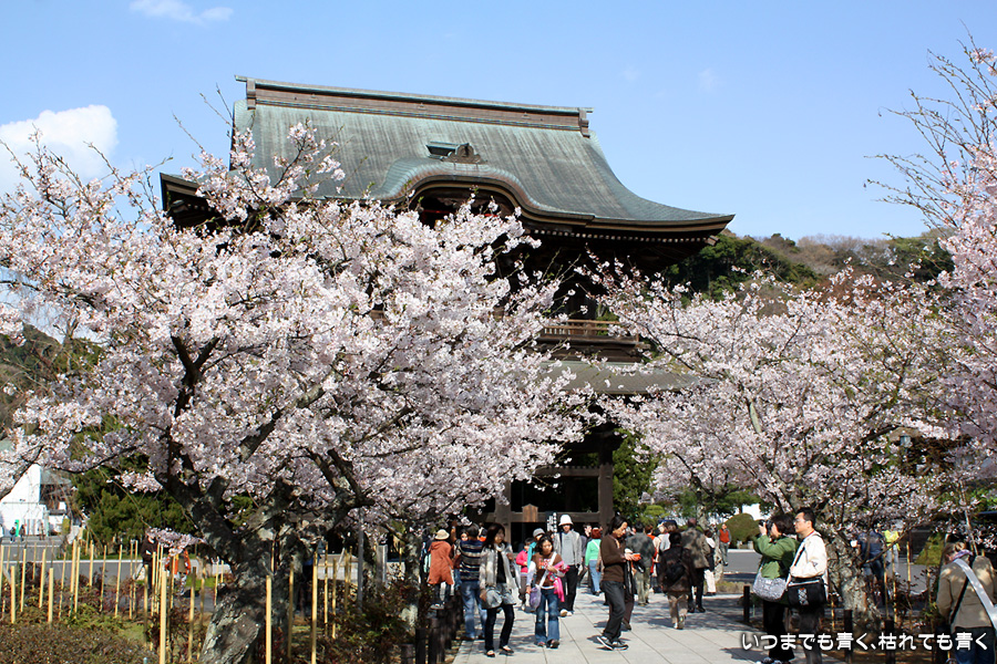 建長寺は、北鎌倉と鎌倉のちょうど真ん中にありますので、今回はこの機会に初めて北鎌倉から鎌倉まで歩いてみることにしました。建長寺は、臨済宗建長寺派の大本山で鎌倉五山第一位のお寺です。鎌倉学園中学校・高等学校を運営しており、桑田佳祐がその学校の出身であることは有名です。けんちん汁のいわれのお寺でもあります。総門と立派な三門の間には美しい桜並木があります。みんな満開でとても綺麗です。建長寺の境内は全体的に非常に美しく保たれており、どこで写真を撮っても絵になります。枝垂桜はまだ蕾も多かったですが、可憐な美しさを感じさせてくれました。方丈の中にはいると庭園を眺めることができます。板の廊下に座ってぼやっと庭園を眺めていると心が落ち着きます。