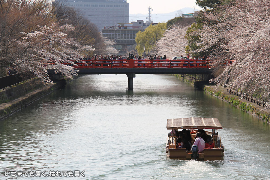 疎水の桜は八分咲きくらいでしょうか、かなり見ごたえがあってきれいでした。時折やってくるお花見船と赤い橋が風情のある光景を作り出してくれます。