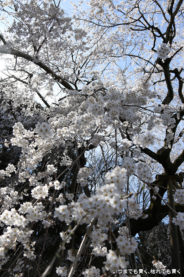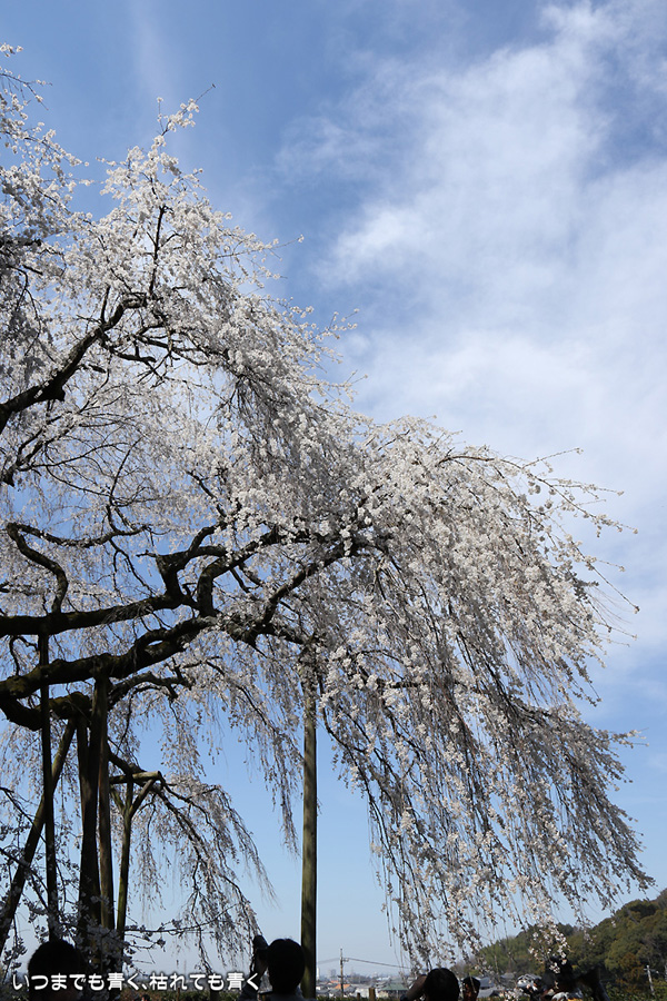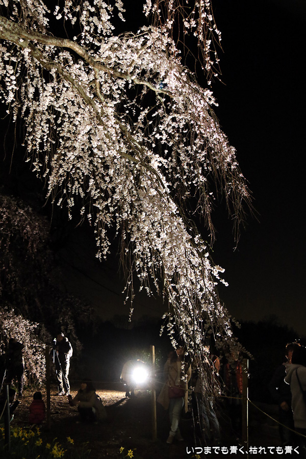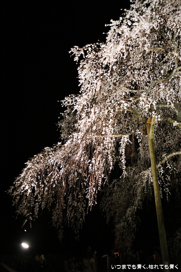 1300年ほど前に持統天皇が村積山行幸の際にお手植えされたと伝えられ、天然記念物に指定されているしだれ桜です。今日はちょうど見ごろでたくさんの人が集まっていました。ライトアップも見たくて夜にも行きましたが、昼よりも存在感がありました。三脚を据えて撮影している人が多かったですが、私は時間もなかったので手持ち撮影。おかげでピントのあまい(手ブレとも言います)写真ばかりになってしまいました。