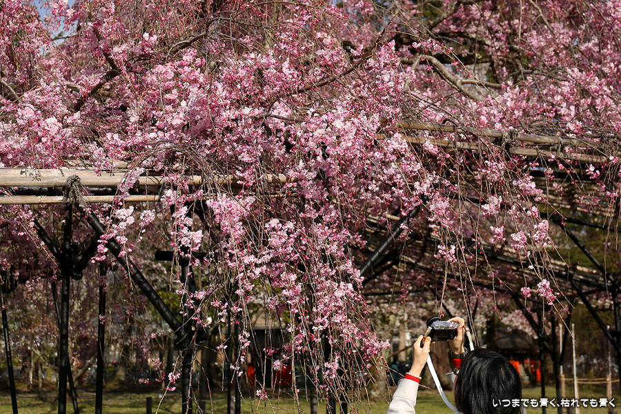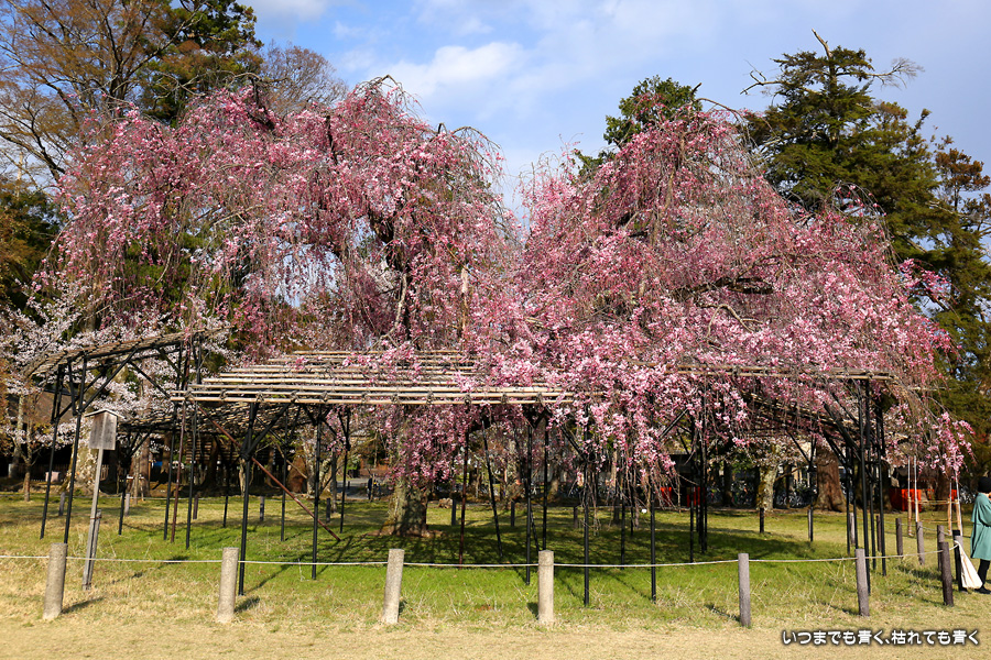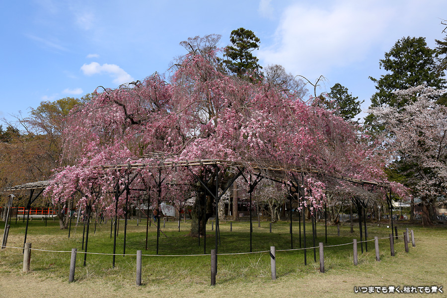なんにも考えずに、京都の桜を見ようと出かけた今回の旅ですが、最後に、御朱印巡りの間伐材のコースターをいただくために上賀茂神社を参拝しました。上賀茂神社の桜といえば、斎王桜と御所桜ですが、御所桜はすでに見頃を終え葉桜でした。二の鳥居の東側にある風流桜と西側にあるみあれ桜はまだ楽しめました。