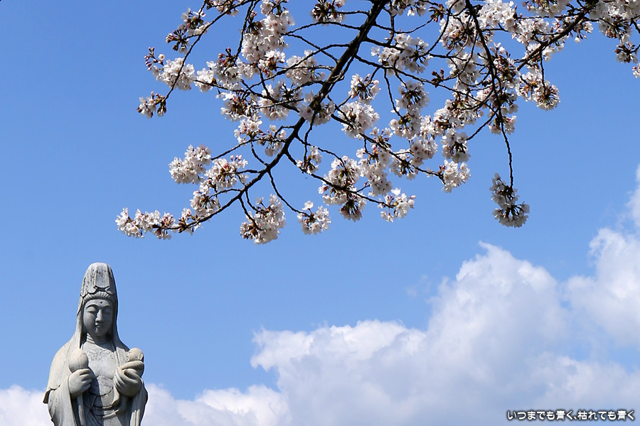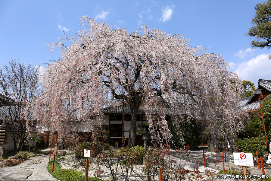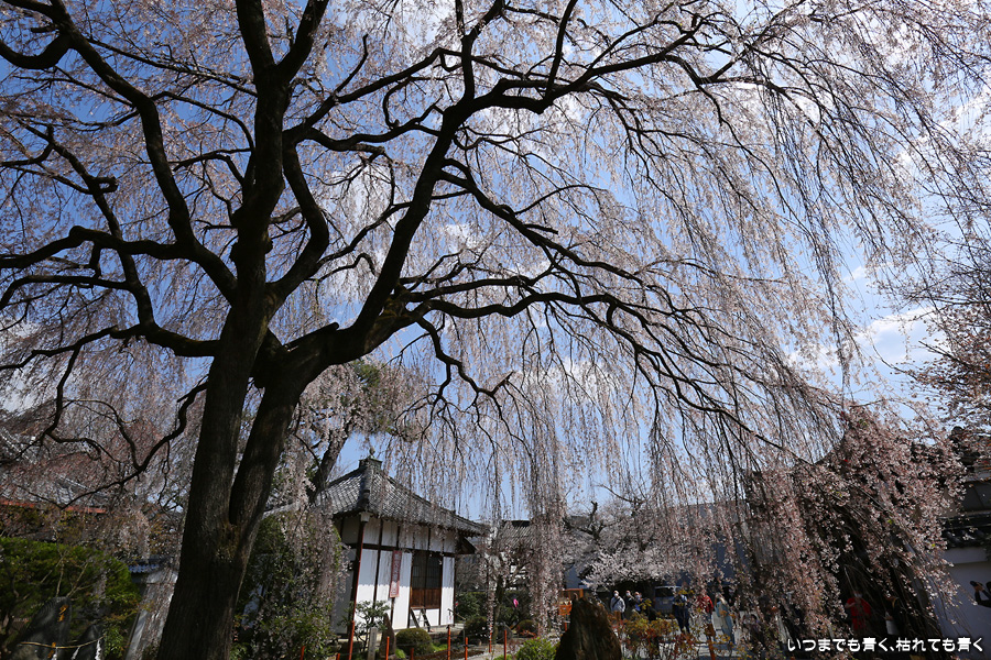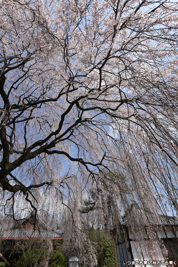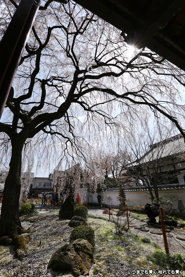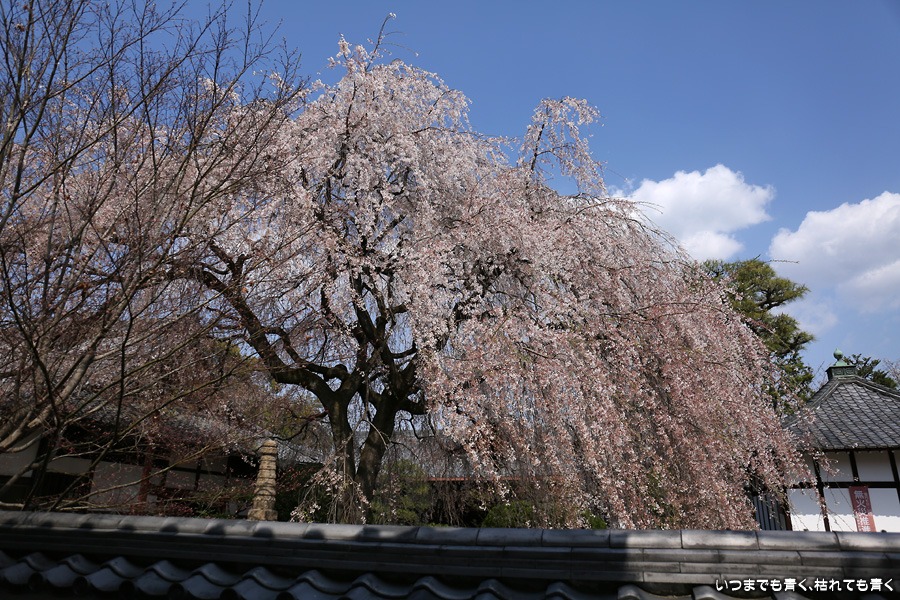 このお寺には、見事な枝ぶりのしだれ桜があります。西門を入り左手にあるしだれ桜を見た時は、あまりの存在感に思わず声をあげてしまいました。すでに一番の見ごろは過ぎているようで、少し風が吹くと花びらが流れるように散っていきます。それもまた美しい光景でした。