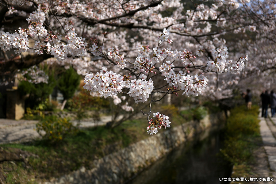 哲学の道の桜は、満開の時に訪れると琵琶湖疎水の上を桜がアーチのように覆っていて、とても美しい光景を見せてくれます。散り始めた時のピンクの花びらに染まる疎水の流れも素敵です。最初の4枚は疎水脇の桜ですが、銀閣橋の手前の写真ですので厳密には哲学の道ではありません。