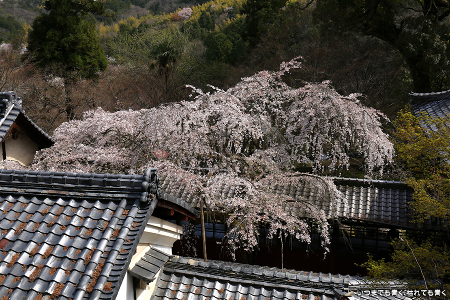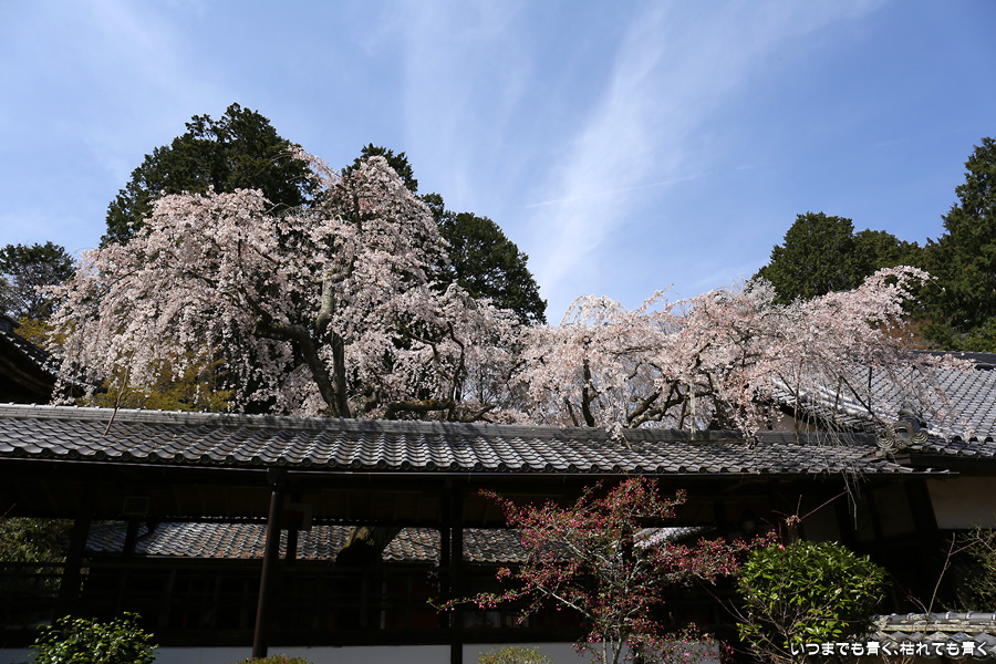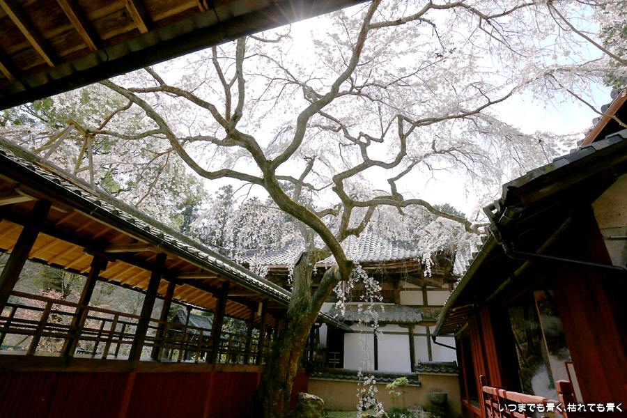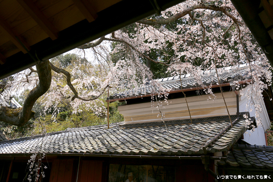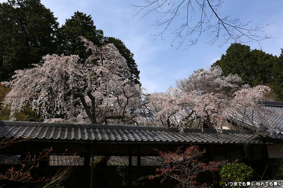 十輪寺は、昨年秋に紅葉を愛でに初めてきたお寺で、中庭のしだれ桜の咲いた光景を見たいと思って訪れました。すでに散り始めていましたが、まだ見頃で楽しめました。中からの写真は明暗の差が大きく、スマホならば美しく撮れますが一眼レフではあとでの現像作業が必須の悪条件でした。掲載した写真のうち、一枚はスマホで撮影した写真です。