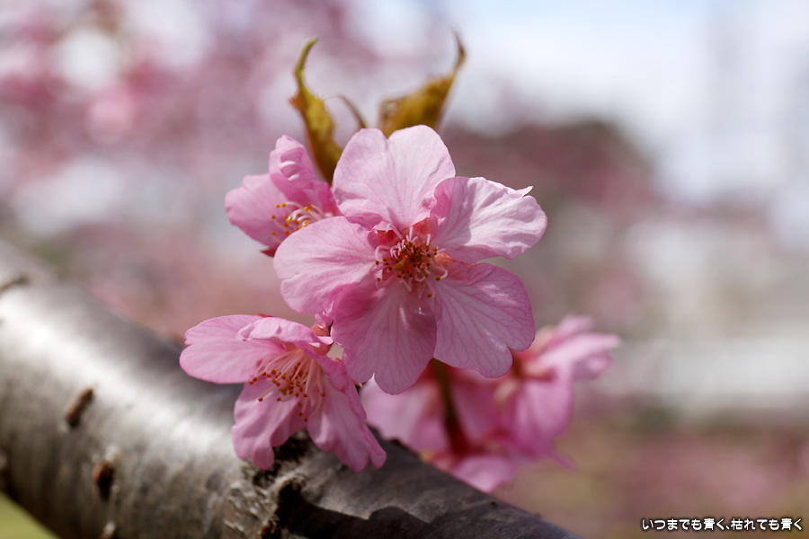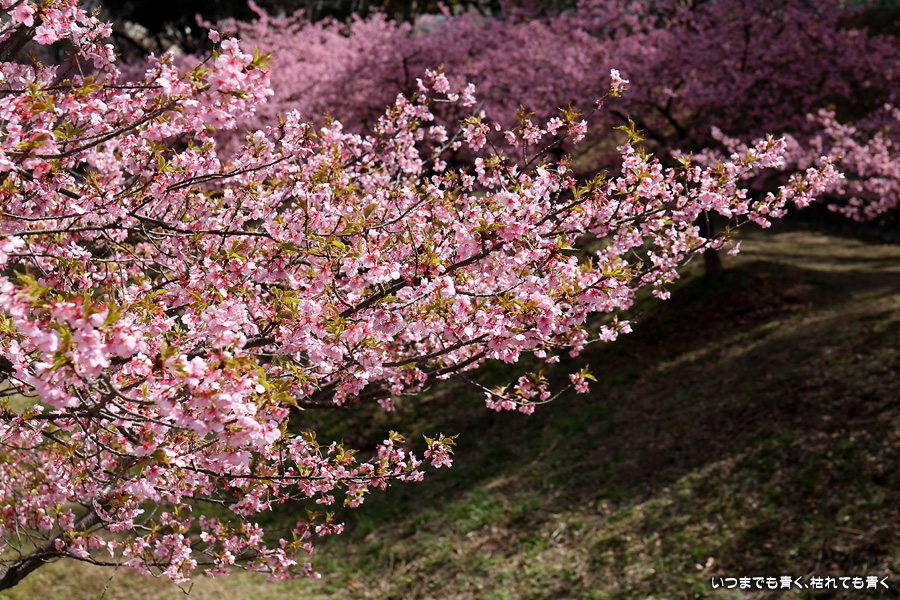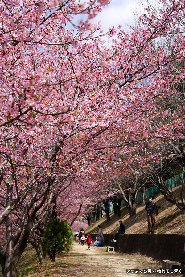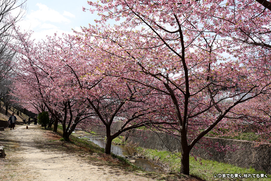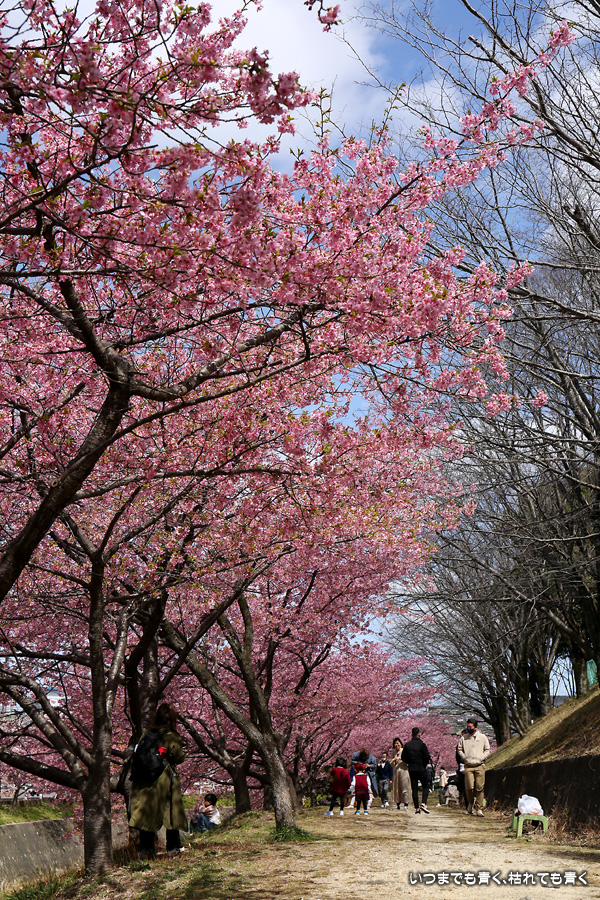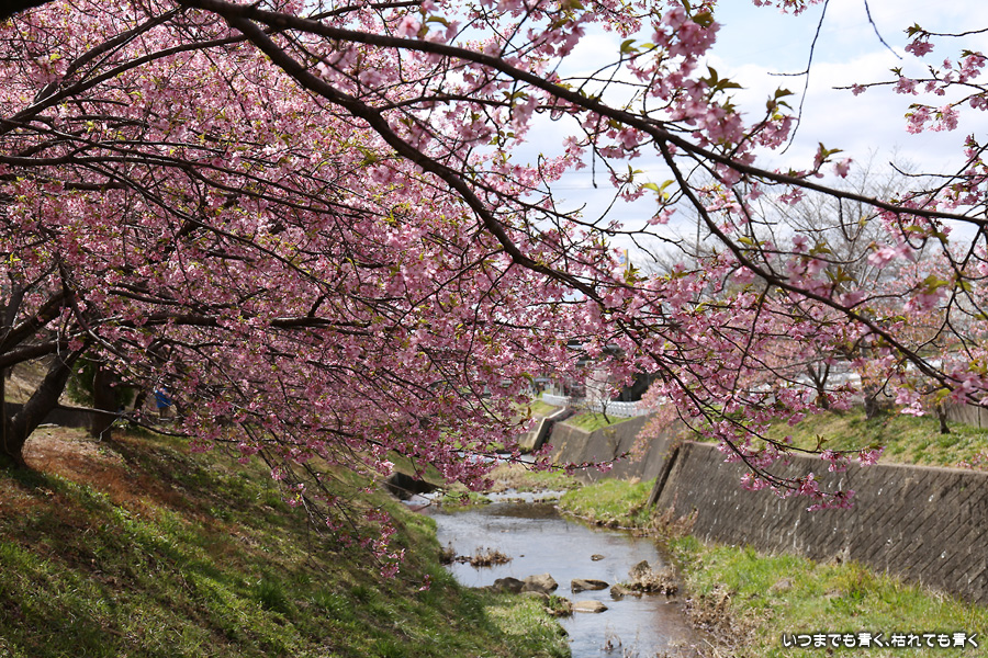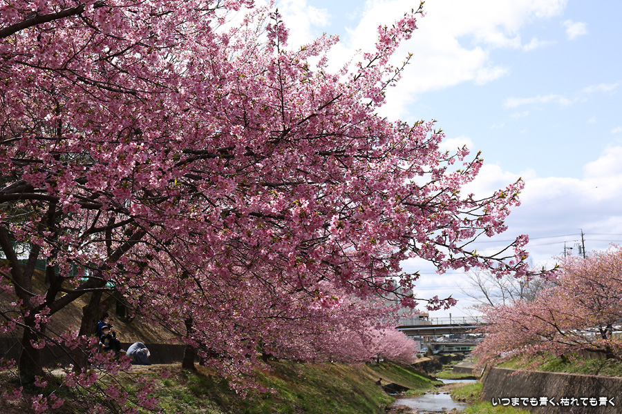 距離はそれほどありませんが、加茂川沿いにある河津桜並木です。水辺に降りることができるのでいろんな方向からの花見や撮影を楽しむことができます。