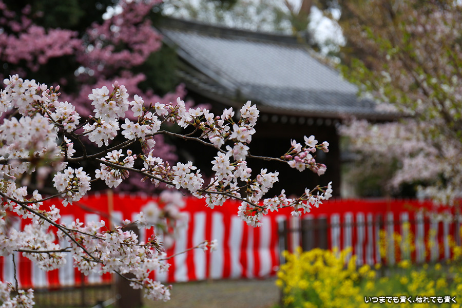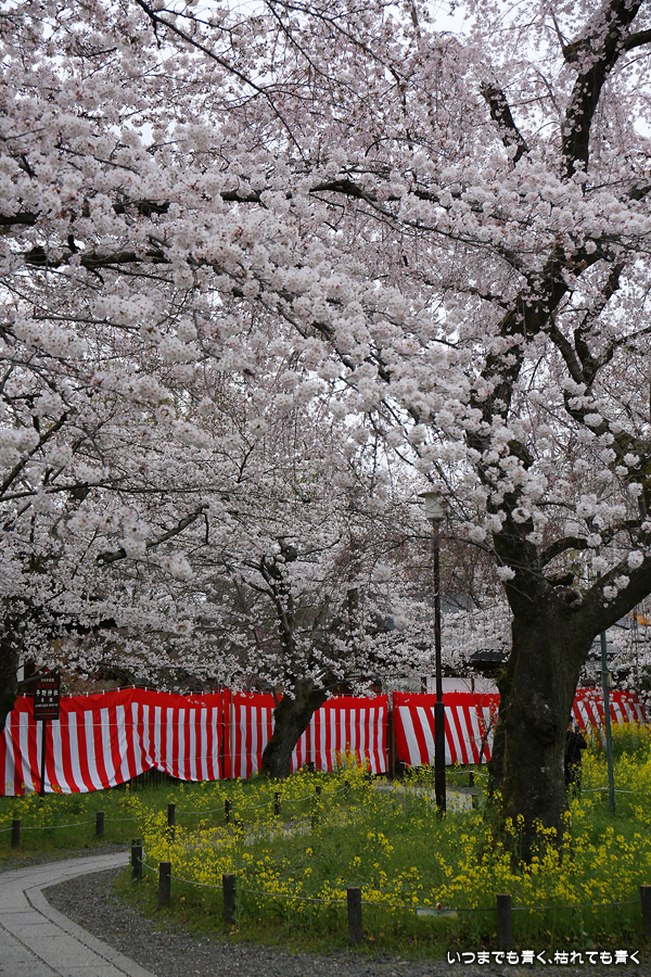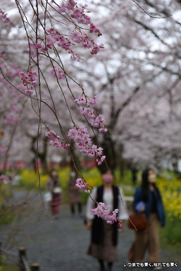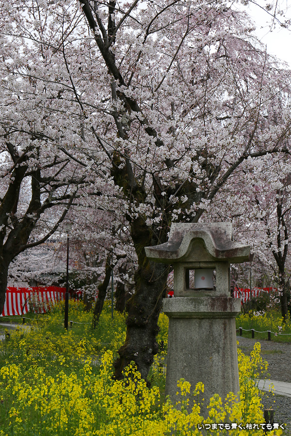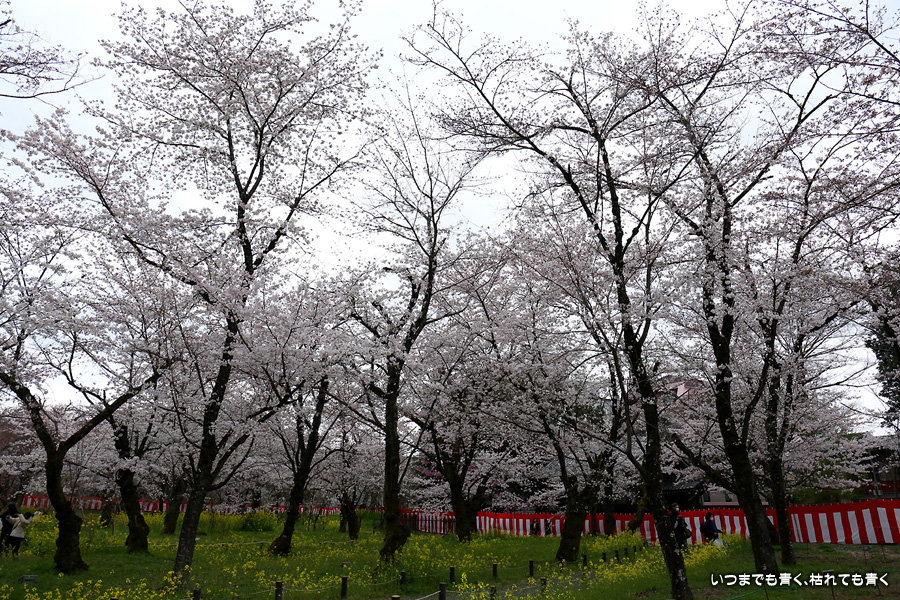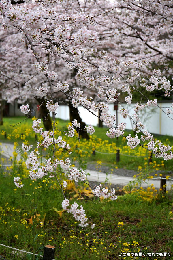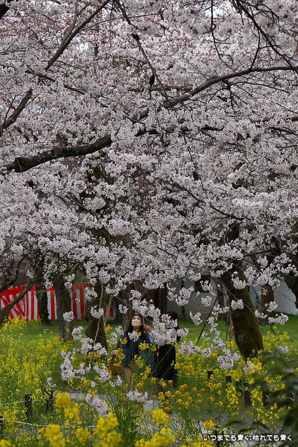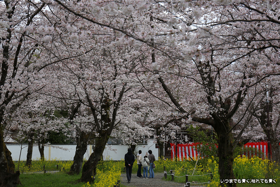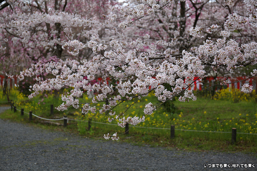 平野神社は2019年の秋以来の参拝となります。その時に広い桜苑があることを知り、今回桜苑目当てに訪れました。桜苑の外の写真と桜苑の内の写真を別にしてあります。こちらは桜苑の内の写真になります。空を覆うような満開の桜が壮観でした。桜の花の色と菜の花の色もメリハリがあって良かったです。今回は天候に恵まれませんでしたが、その天候と訪れた時刻の影響なのか人が少なかったので、撮影は人を気にせずにストレスなく楽しめました。