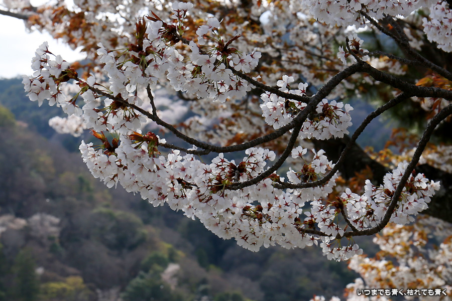 大覚寺から法金剛院へ行く前に、駐車場に戻るには反対方向でちょっと遠回りになるのですが渡月橋に立ち寄りました。渡月橋と桜の写真は風流な感じがして、ぜひ写真に残したかったのですが、写真撮影にはあまり良い状況ではありませんでした。桂川は工事中で工事車両が作業中で邪魔ですし、桜も葉が目立ってきていました。そういう状況と時間がなかったこともあり、橋を渡って反対側の桜を見ることは断念しまし、早々に切り上げて法金剛院に向かいました。最後の写真は天龍寺内にあった桜です。