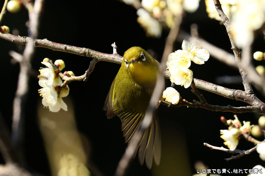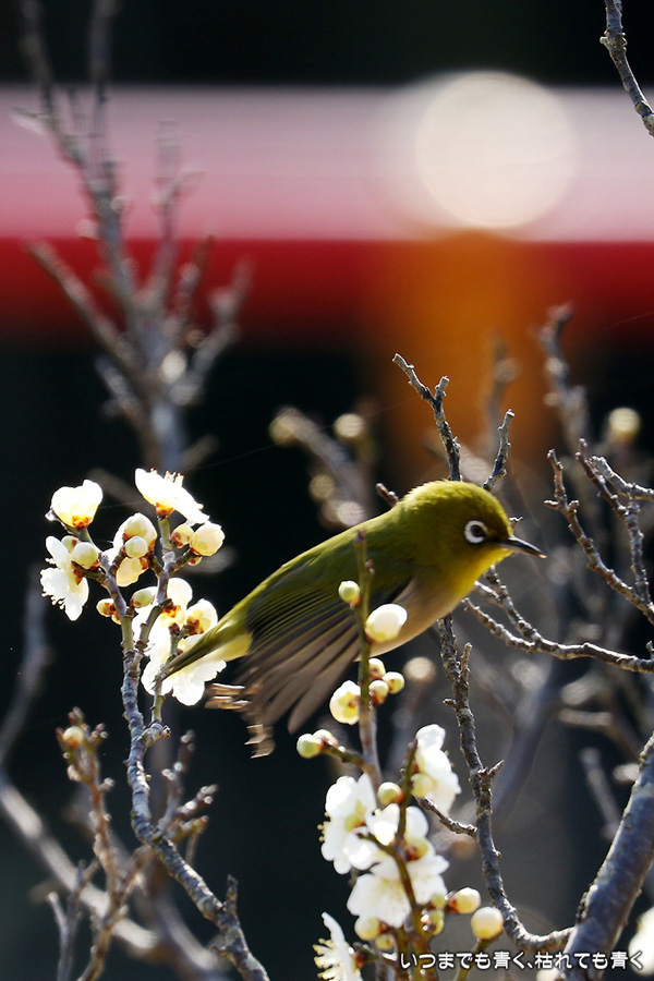 今日は年休をとったので、また平芝梅林公園でメジロと戯れてきました。メジロが飛び立つ瞬間の翼を広げる姿を狙いましたが、狙って撮れるものじゃありません。動きが素早く、高速連写でもファインダーの外に一コマで飛び出すし、ピントを合わせきれないし、難しいです。梅の花の見ごろもそろそろ過ぎてきました。今年の梅とメジロの競演はもう終わりですね。