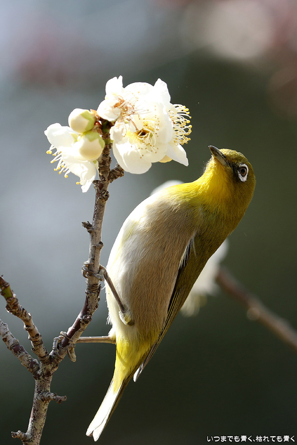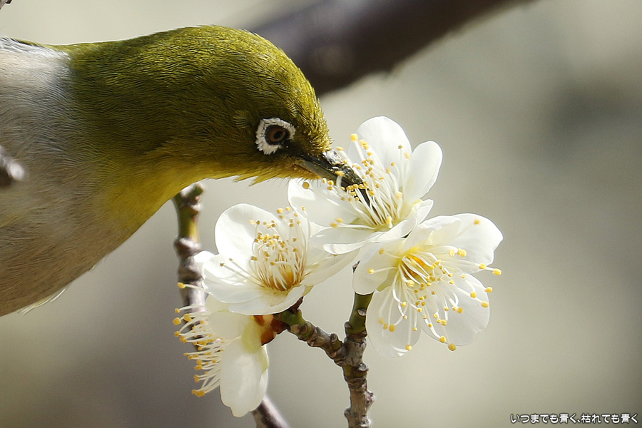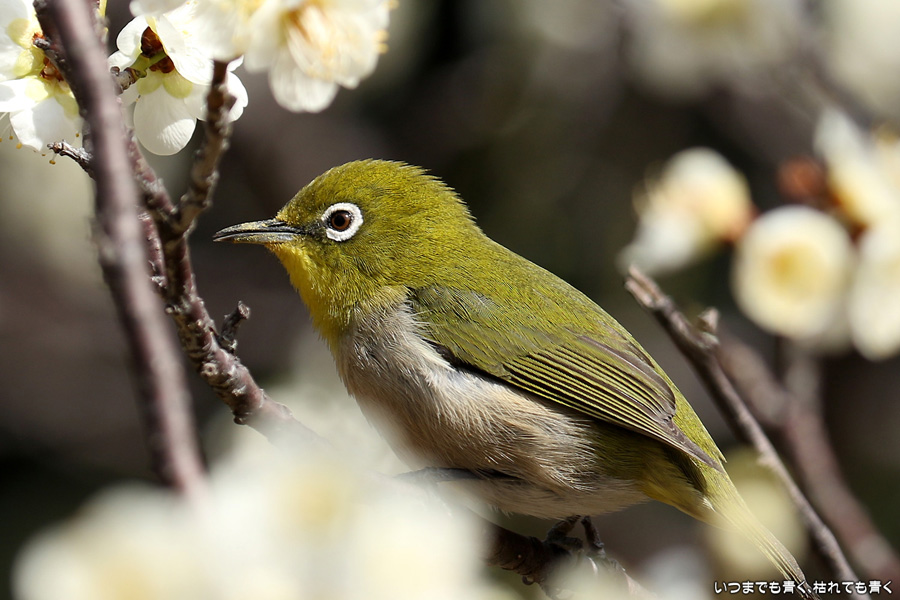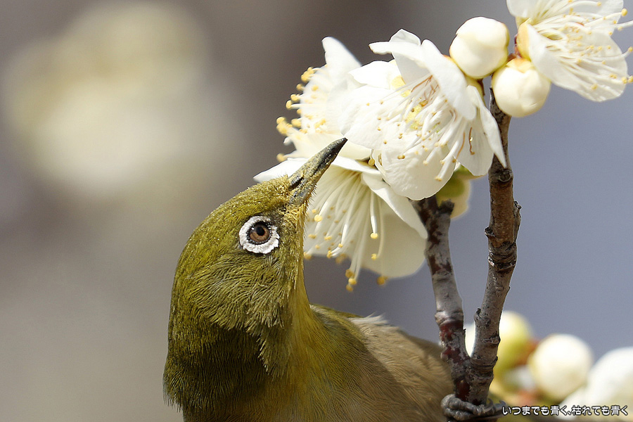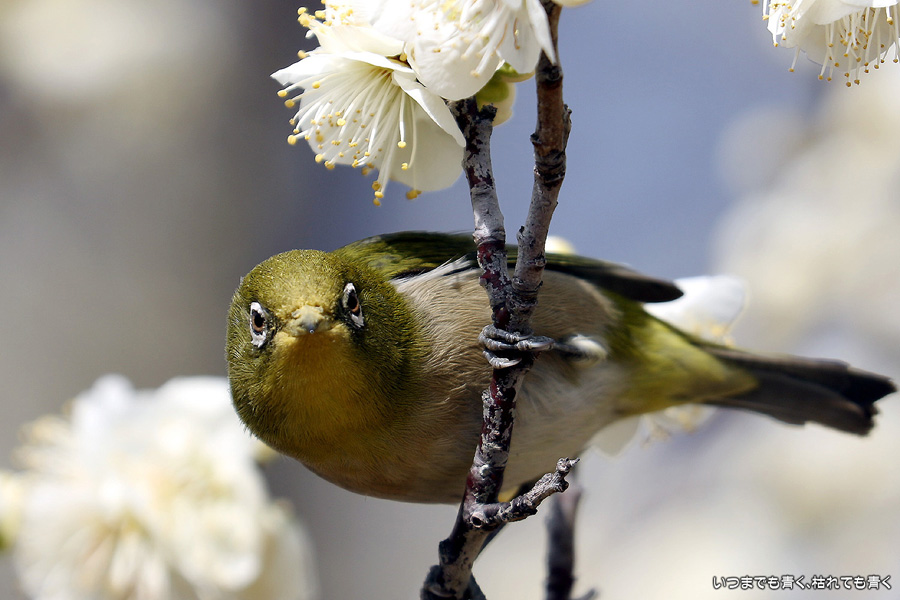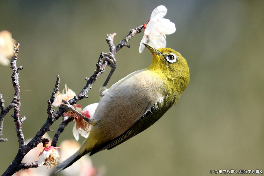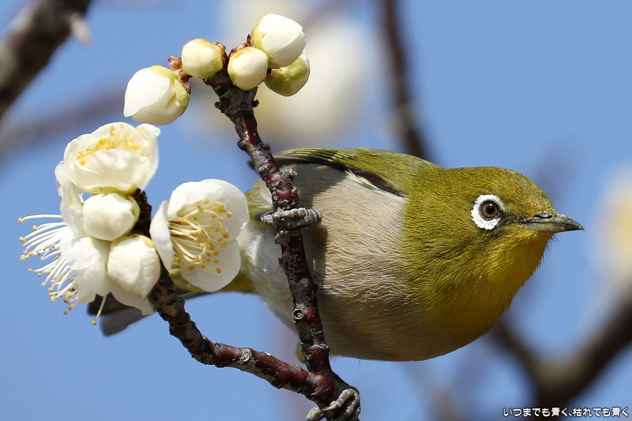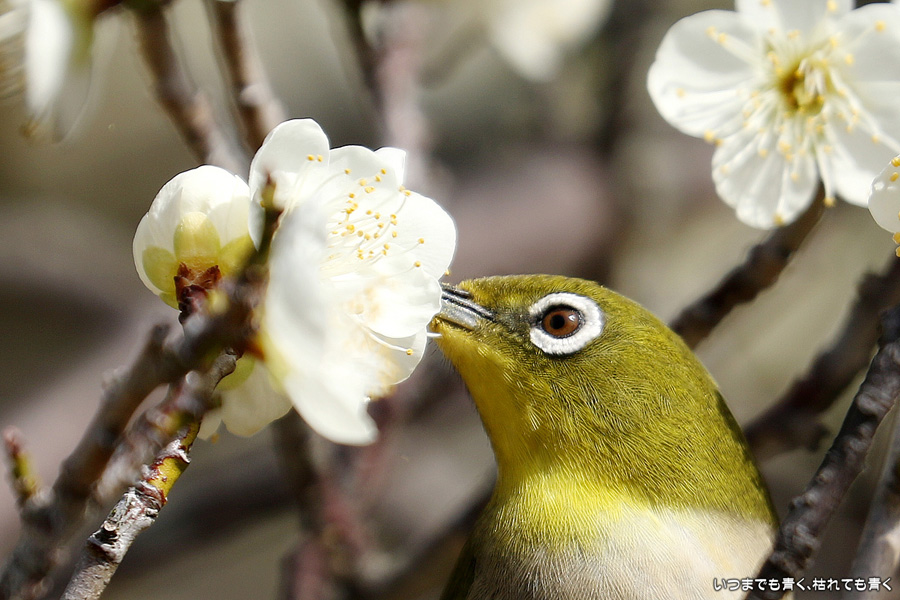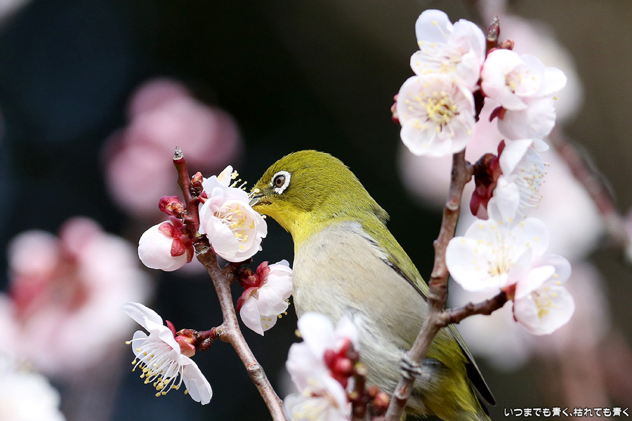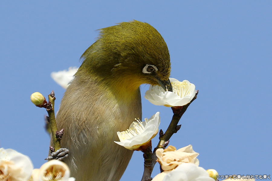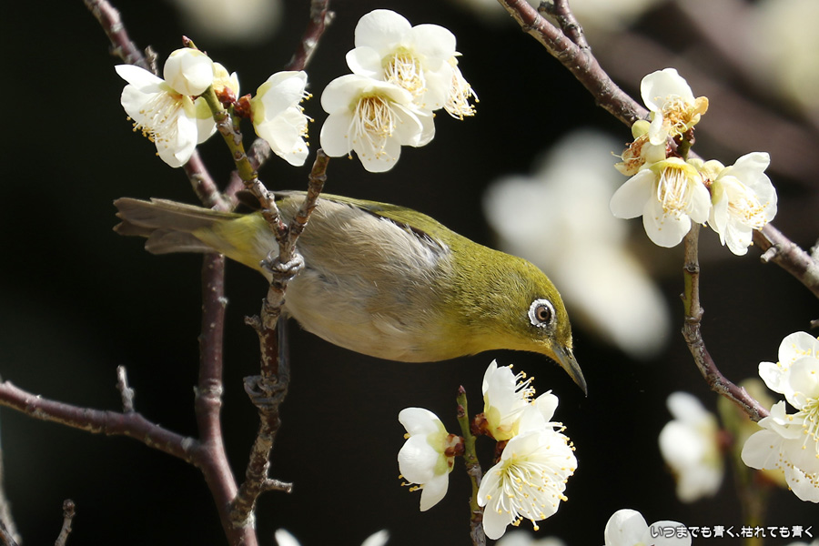2021年2月27日に撮影した、愛知県豊田市・平芝梅林公園の梅に集うメジロの写真です。