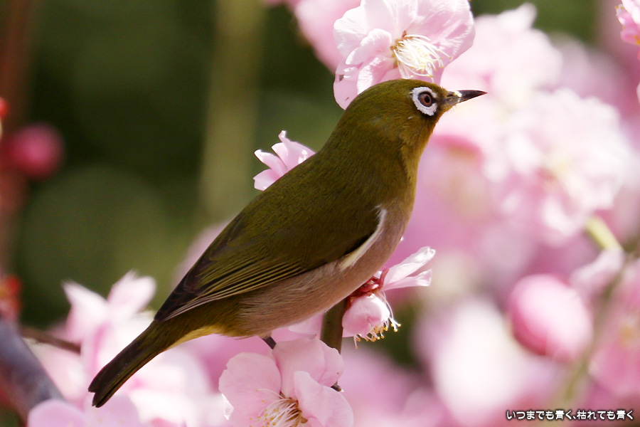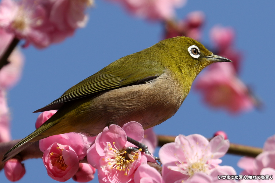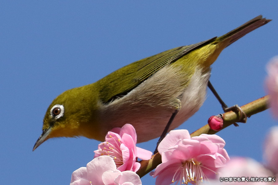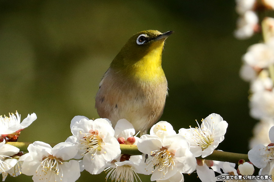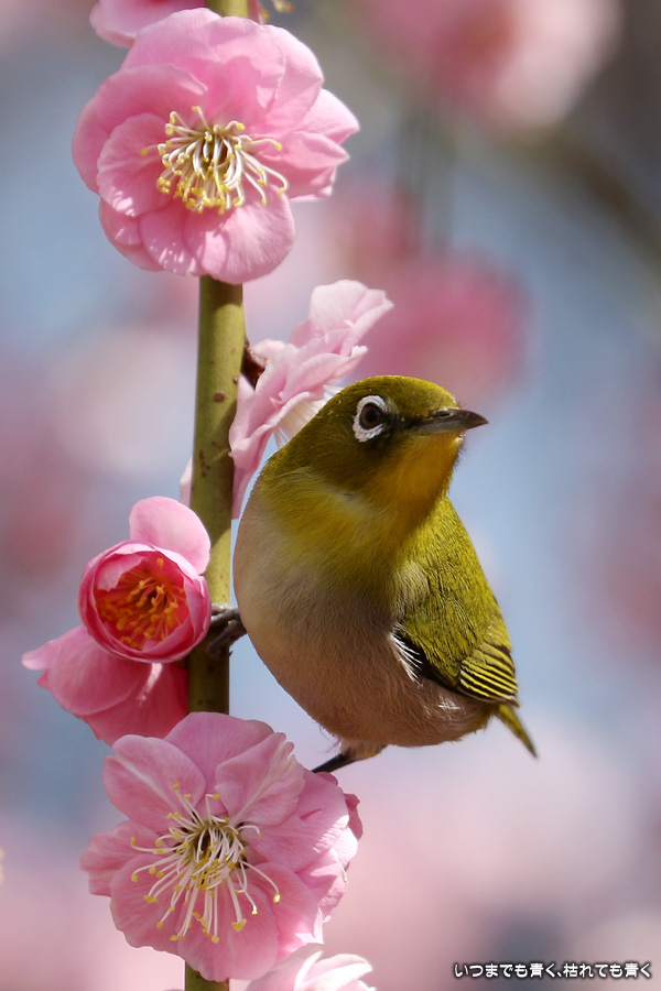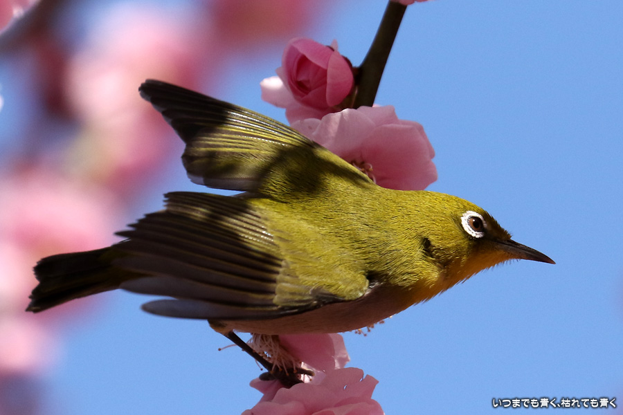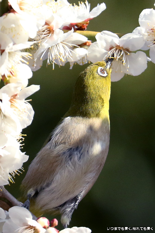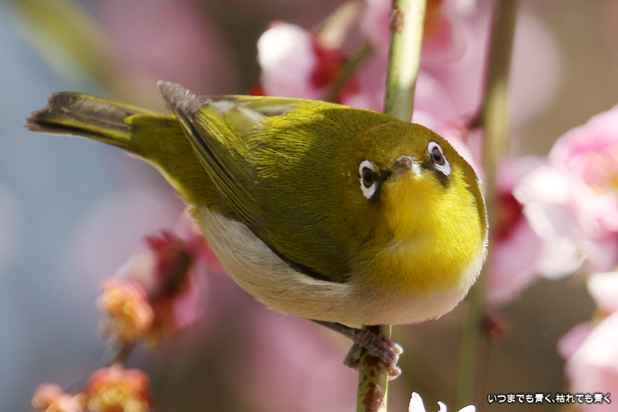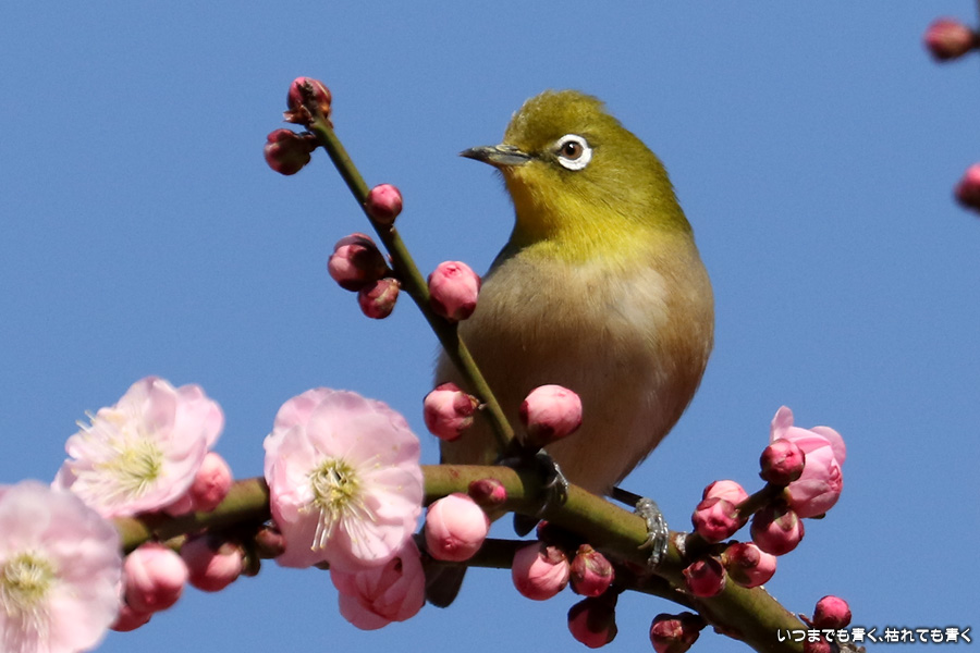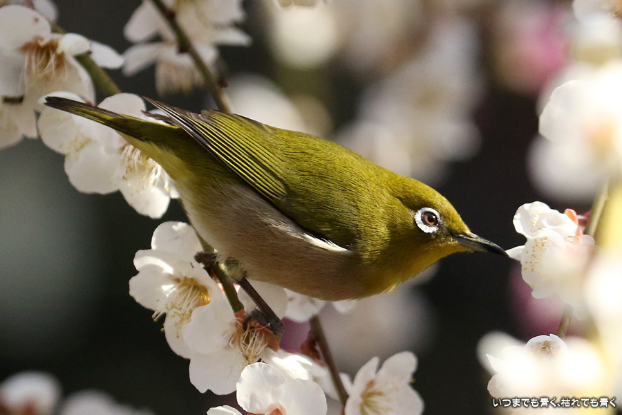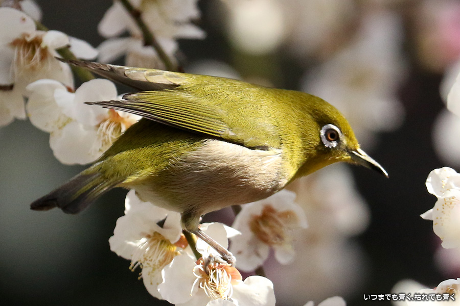 素晴らしい城南宮のしだれ梅にはたくさんのメジロが集っていました。しかし城南宮のメジロ撮影は、しだれ梅の枝が多くて邪魔になったり、花が多いのでメジロの動きが素早かったり、撮る側の人が多くて撮影ポジションを取れなかったり、けっこう難しい撮影でした。