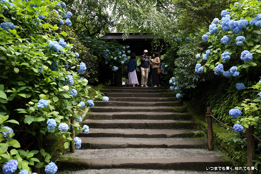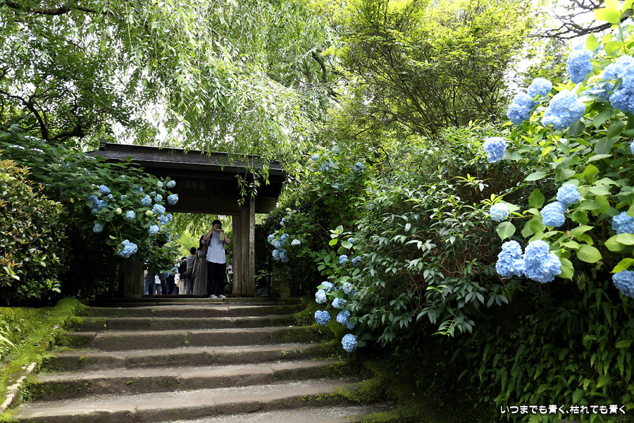 「ここは青い紫陽花ばかりだね」という声がたまに聞こえてきますが、明月院と言えば明月院ブルーの紫陽花です。今年は早めに来たせいか花が若々しくて美しいものばかりでしたが、人が多くてコロナ前の状況に戻ったかのような盛況さでした。御朱印は今年は書置きのみの対応でした。