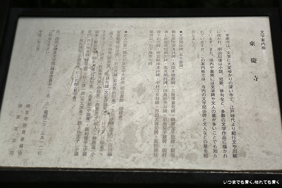 久しぶりの東慶寺ですが、拝観しようと石段を登ったら「境内全域撮影禁止」の立て札がありました。そのかわりに拝観料も取っていないようです。東慶寺のご住職にお話を伺ったら、参拝者に迷惑や文句を言ったり立入禁止のところにはいったりするカメラマンがいてトラブルが多くなったからだそうです。それを注意するカメラマンともトラブルがあったそうです。写真が趣味の人が増えるのはいいですが、ルールやマナーを守れない人はたしかによく目につきます。京都でも、自分が撮りたいところに人がいると「どけ」とか言っている人がいたので(私自身も言われた)、「公共の場で写真を撮る側にそんなこと言う権利はないので、人がいなくなるのをじっと待つのがマナーですよ」と話をしたこともあります。いろいろと考えさせられました。