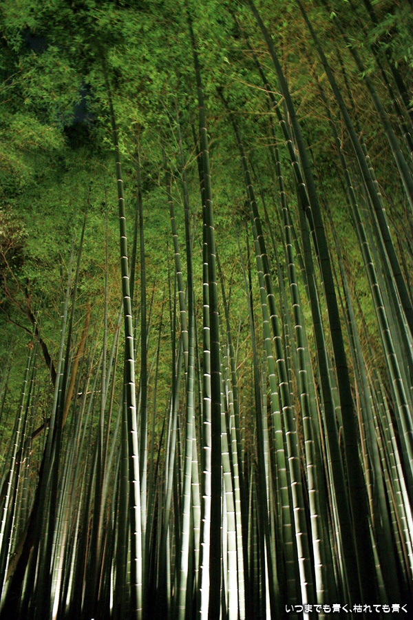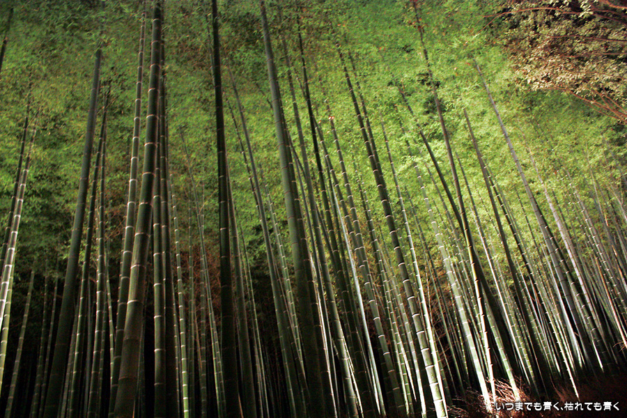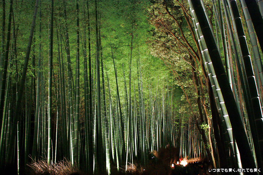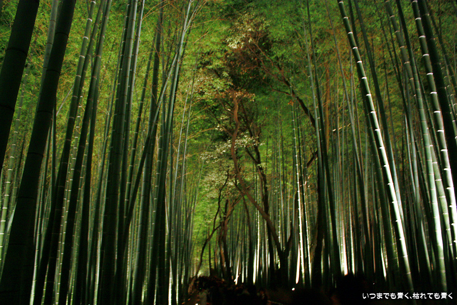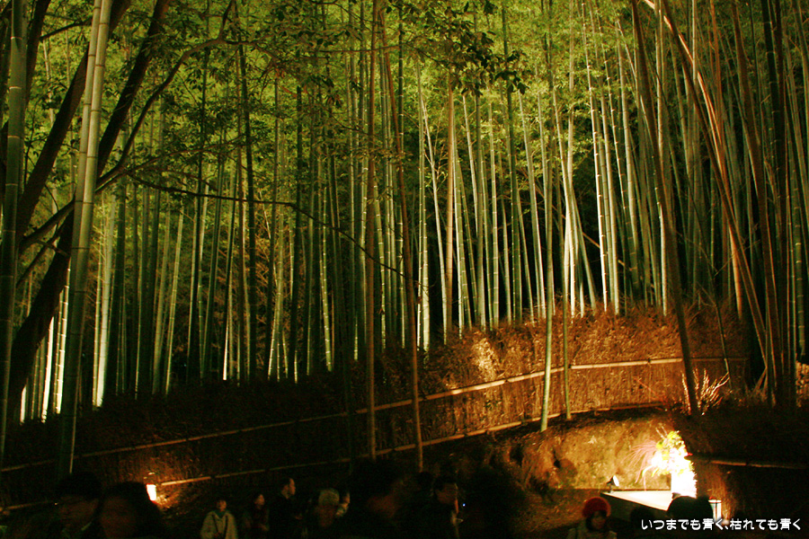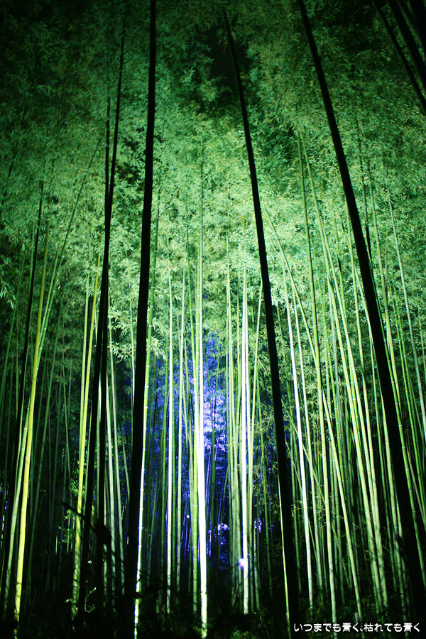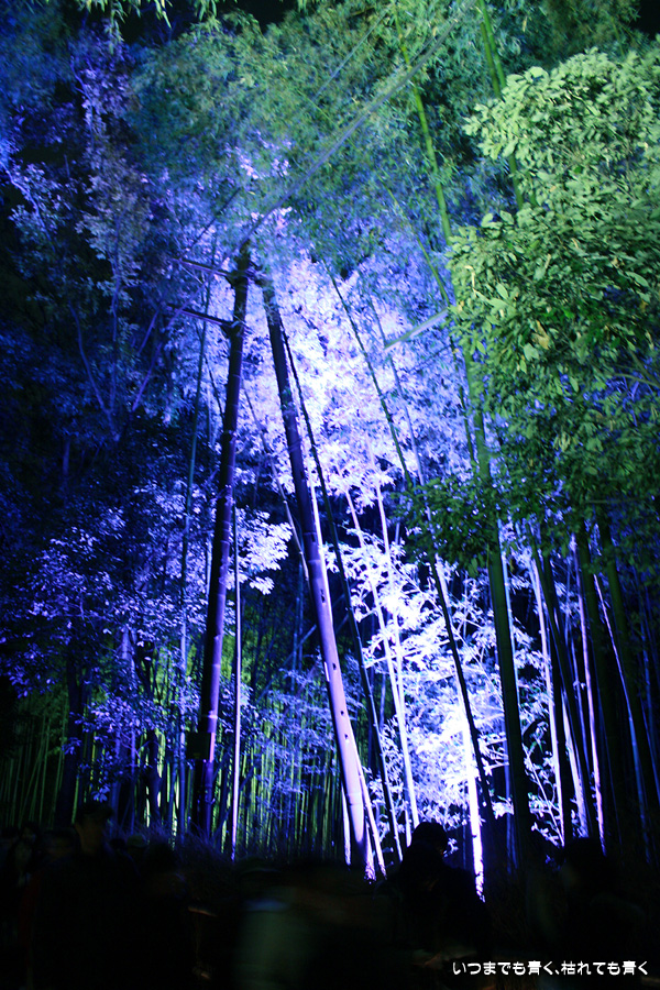 常寂光寺を出て南に進むと、クリスマスのようなライトアップが見えてきます。トロッコ嵐山の駅です。トロッコとJRの線路を跨ぐ道を上を通り、しばらくして左に折れると竹林の小径です。この竹林の小径のライトアップは、とても幻想的ですばらしい光景です。通常のライトの中に青いライトが混じってそれがまた不思議な世界を醸し出しています。この光景は一見の価値あり。来てよかったと思いました。写真は手持ちでのスローシャッター撮影でしたのでピント甘々の写真になってしまいました。