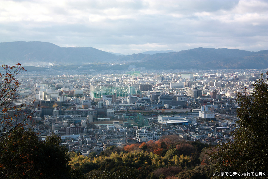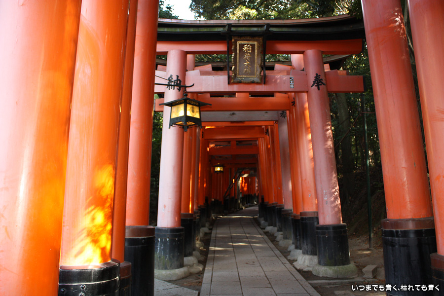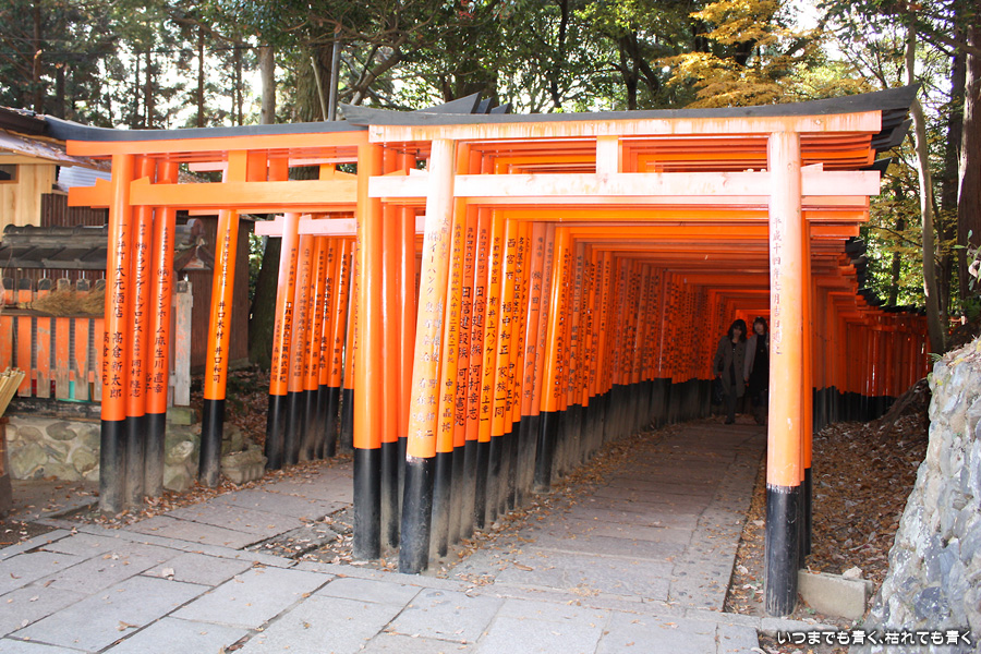 東福寺の次は少し南に下がって伏見稲荷に向かいます。腹ごしらえを御幸道のお店でいなり&うどんの定食を食べてから稲荷山挑戦です。やはりお稲荷さんにはおいなりさんで腹ごしらえです。伏見稲荷の見所は、もちろん朱色の鳥居の続く道。普通ならばあるくのも疲れる山道も、朱色の鳥居をくぐって歩くと、その疲れや単調さも忘れてしまいます。最初の千本鳥居を通ると、奥社奉拝所があり、そこを左に入ると長い傾斜の道が続きます。目標は四ツ辻という京都を見渡せる場所までと決めていたのですが、そこまでもなかなかたどり着きません。でも苦労してたどりついた四ツ辻からの眺めは最高です。さらに奥には一周30分コースがあるのですが、私の今の体力ではここまでが限界でした。すでに足のふくらはぎは痛くて帰りの階段を降りる時には足の膝が震える始末。久しぶりにいい運動になりました。