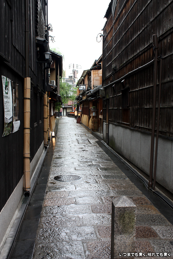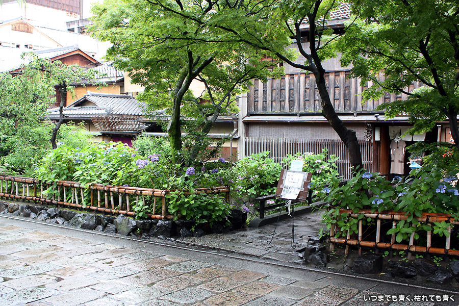 あいにくの雨です。そんなにひどい降りではありませんが傘は手放せない天気で少し残念ですが、かなりの距離を歩くつもりでしたので、日差しが強いよりはいいかと良いほうに考えることにします。スタートは、白川にかかる大和大路通の大和橋。そこから白川南通を白川沿いに行者橋のあるところまで歩くことにします。巽橋や辰巳大明神の付近は、いつ来ても落ち着く場所です。ここは毎回来ていますが、明るい時間に来たのは初めてなので新鮮な気持ちで楽しめました。白川沿いには柳が長い葉を垂らし、道端には紫陽花が美しい花を咲かせていて、雨の季節にぴったりの風情です。濡れて光る石畳にも落ち着きを感じます。このあたりは何もかも大好きです。