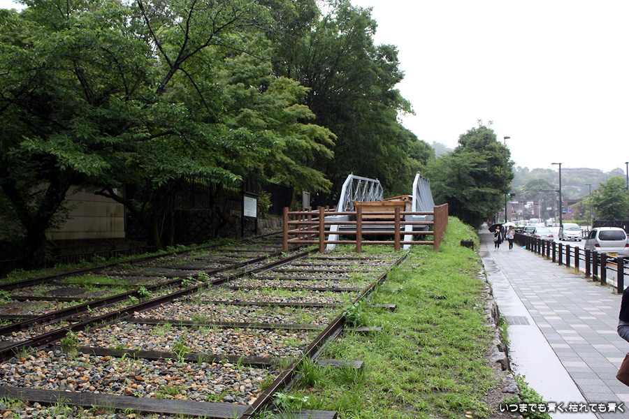 次の目的地は蹴上インクラインです。移動は白川沿いを北に歩き、地下鉄で東山駅から蹴上駅へ移動です。インクラインとは、琵琶湖疎水を利用して琵琶湖と淀川間を船で結んでいた時に、船を乗り降りすることなく坂を昇降させるために作られたケーブルカーのようなものです。レール上の台車に船を乗せて巣力発電で得た電力でウィンチするしくみです。インクラインは春には両側に桜が咲いてとても綺麗な場所なのですが、この時期、しかも雨の中で歩くというのは私のような物好きだけのようです。足を置く枕木を選んで下を向いて黙々と歩いていると、クルマの走る音が突然消えて目の前に台車に乗った船が現れました。蹴上舟留です。その時代にタイムスリップするんじゃないかと思えるような、独特の雰囲気を味わうことができました。近くには蹴上義経地蔵(最後の写真)がありました。源義経が奥州に向かう時にここで平家の一団に泥水を蹴り上げられたためにその一団を切り殺したために、村人がそれを弔うために石仏を安置したものです。周りは疎水公園となっており、緑のこけの木々がとても幻想的でした。あとで調べてわかったことですがもう少し南に行くと日向大神宮があるようです。いつか機会があれば訪れたいと思います。