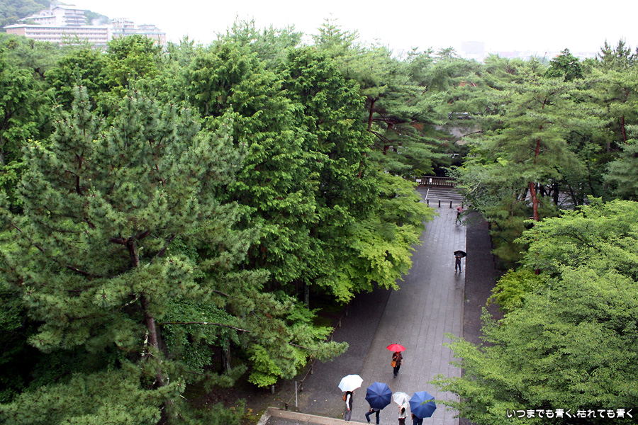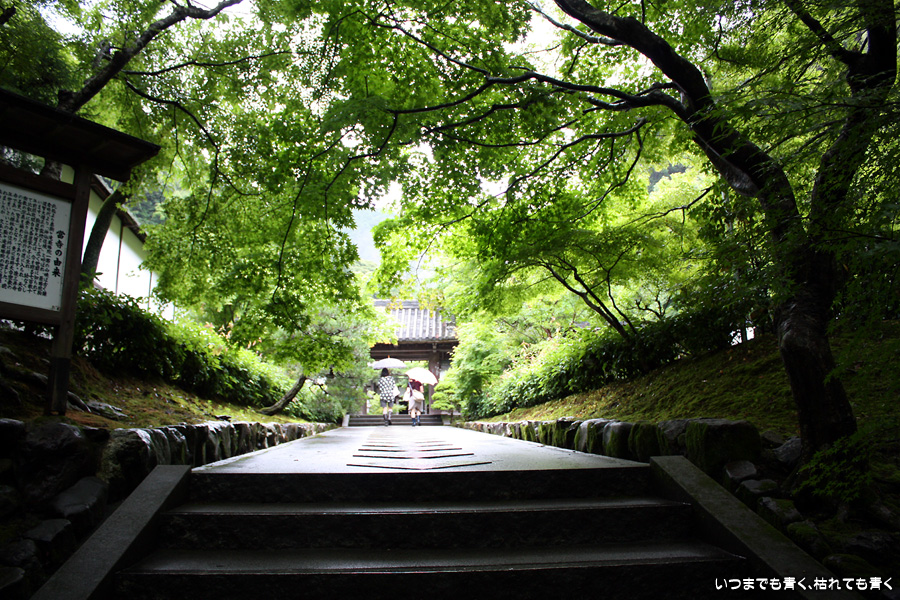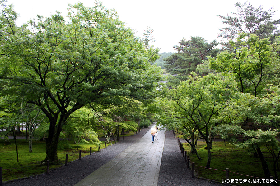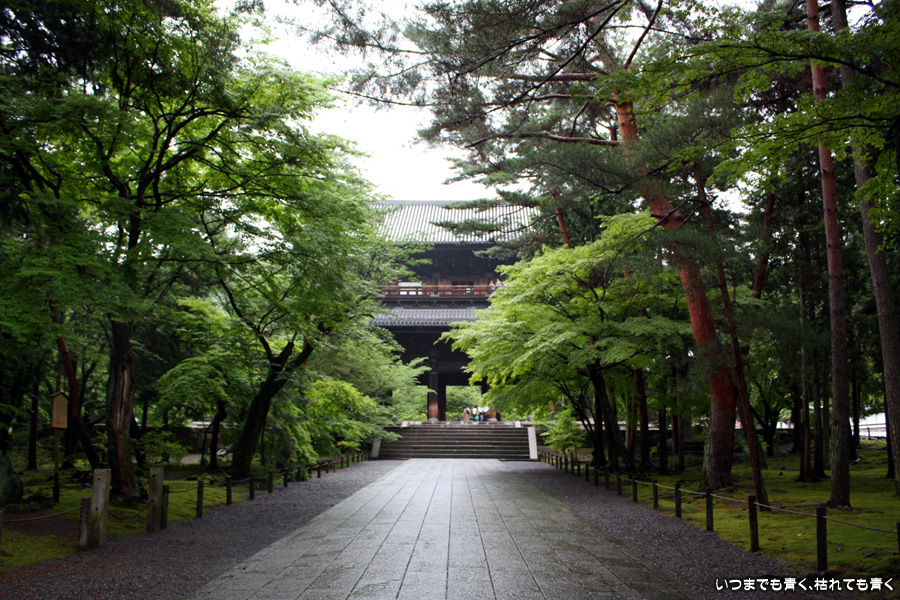 インクラインを楽しんだあとは南禅寺に向かいます。南禅寺には、疎水公園の入り口から金地院の前を通って三門前に出る小路を歩いていきます。これもあとで知ったのですが、疎水公園の上の疎水沿いの道を行けば、水路閣に続く水路を上から眺めながら南禅寺まで行く事ができたそうです。次回は絶対のそのルートを歩いてみたいと思います。南禅寺では、水路閣の下で写真を撮ってドラマのシーンと重ね合わせて楽しんでいましたが、アーチが何重にも連なる構図での撮影を忘れてしまいました。中途半端なアーチの重なりの写真は撮ったのですが、上流側の端から下流側を眺める一番いい構図を撮影しないで帰ってきました。今回は雨を避けたり、カメラのレンズを気にしたりということで焦って、現地での的確な判断がかなり鈍っていたように思います。水路閣を撮影したあとは、2年前に来た時を思い出して三門でのんびりと新緑の山を眺めて心を癒しました。三門拝観時間の17時を過ぎてしまい、途中で三門を追い出されてしまったのは残念でしたけど、これは仕方ありません。