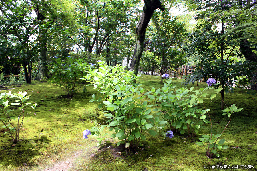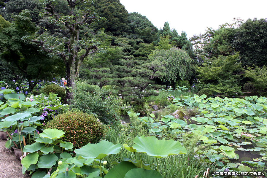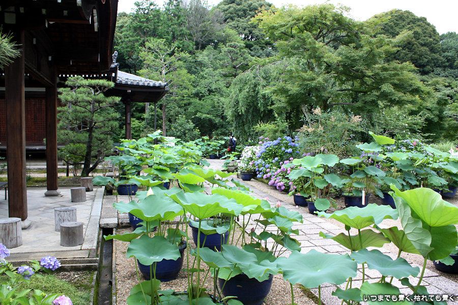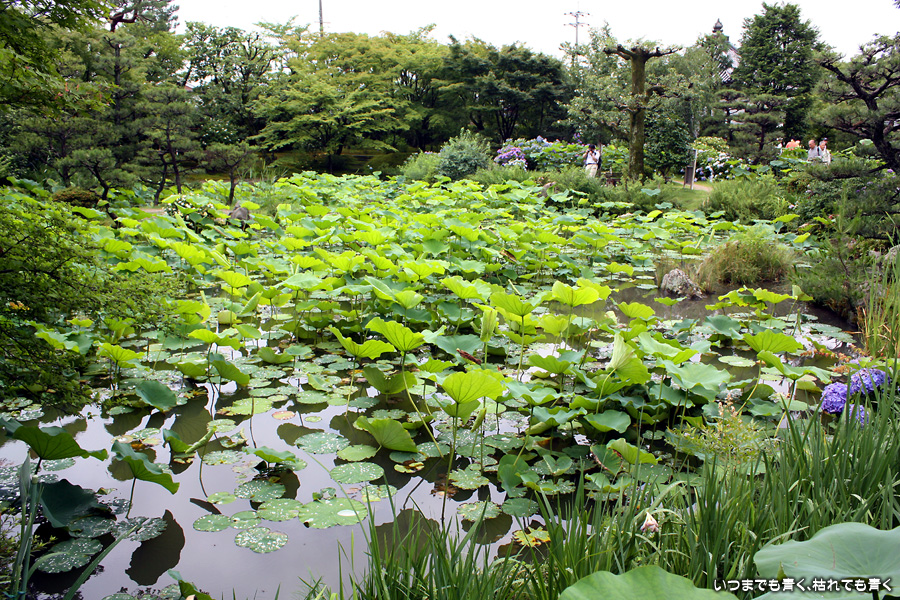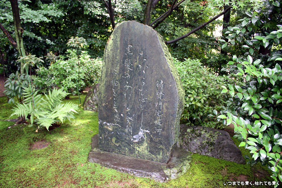 「活動寫眞の女」という小説で知った待賢門院ゆかりのお寺です。拝観料を払って中にはいると、鉢に植えられたたくさんの蓮と、その背景には色とりどりの紫陽花が目に飛び込んできます。奥には池があって、その水面一面には蓮の葉が覆っています。残念ながら少し時期が早くて、極楽浄土の光景は見ることができませんでしたが、蓮や紫陽花を歩きながら眺めているだけで心落ち着くいい場所です。ここには、待賢門院璋子に使えていた女房の待賢門院堀河の和歌「長からむ 心も知らず 黒髪の 乱れて今朝は ものをこそ思へ」の歌碑もありました。百人一首80番の歌で、恋人との情事のあと、恋人の心を計りかねて乱れた黒髪のように心乱れて思い悩んでしまうという歌です。待賢門院璋子もなかなか艶やかな女性ですが、待賢門院堀河も過激な歌を詠むものです。意味を知ると、この歌碑もなんとなく身近に感じられる気がするのは私だけでしょうか。