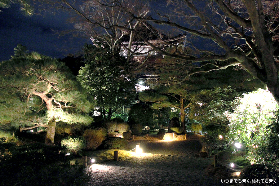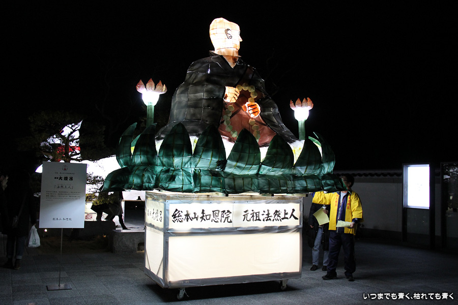 次は知恩院の三門に映し出される「幻想の灯り」を見に行きました。しかし、知恩院の三門前に着きましたが何も映っていません。三門の前にいたスタッフらしき女性に聞いてみると、三門の裏でやっているとのこと。脇の道から境内に入っていくと、やっていました。大きな三門をスクリーンにして、いろいろな光のアートを映し出していました。石段に座って巨大スクリーンを鑑賞するのはなかなか楽しかったです。ただ、花灯路が21時半までなのに対して、すでにこの時点で時刻は21時を過ぎており、「幻想の灯り」を楽しむのもそこそこにして、急いで知恩院の友禅苑に入りました。暗い中で一部がライトアップされた庭園は幻想的でしたが、ちょっと消化不良。ここは明るいときに楽しむ庭園かなという感じでした。