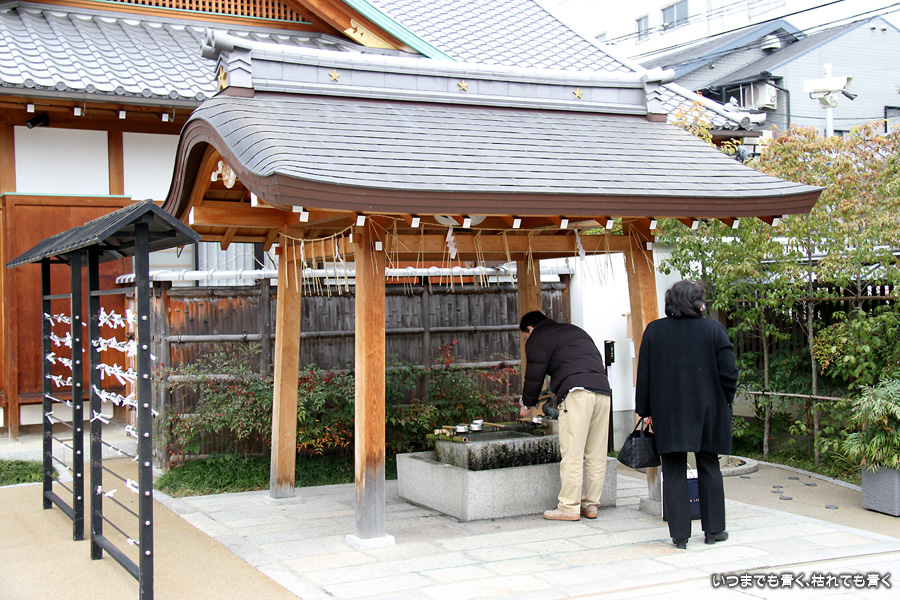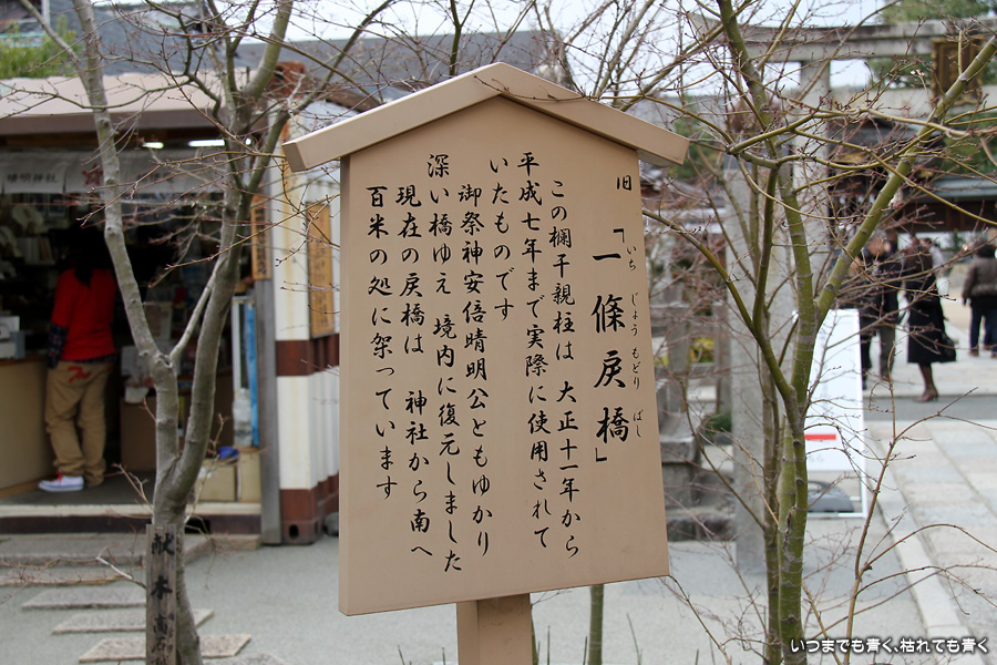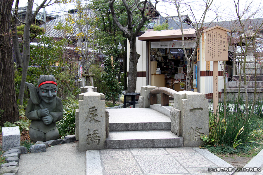 神社のいたるところに魔よけの記号である「五芒星」が掲げられています。販売所には、「五芒星」のついたお守りなどが売られていますので、パワーが必要な人はぜひ買ってみましょう。さらに境内には、病気平癒のご利益があるという安倍晴明が念力で湧出させた水が湧き出る「晴明井」があります。飲んでも問題ないそうですが、ご利益を後で知ったので飲まずに帰って来てしまいました。次に行く機会があれば、ぜひ飲んでみましょう。晴明神社の前には、大正11年から平成7年まで実際に使われていた旧一條戻橋が復元され、その脇には式神の石像がちょっと不気味な感じで鎮座されています。現在の一條戻橋は、晴明神社のすぐ南の堀川に架かかるところにあります。一條戻橋というのは、熊野の僧・浄蔵が父の訃報を聞いて紀州熊野から京都に駆けつけた時、葬列がちょうどこの橋の上を通っており、そこで浄蔵が棺にすがって泣き悲しみ神仏に祈願したところ、不思議なことに父が蘇生したという伝説から戻橋と名付けられ橋です。そういうことから、「あの世」と「この世」をつなぐ橋とも言われています。