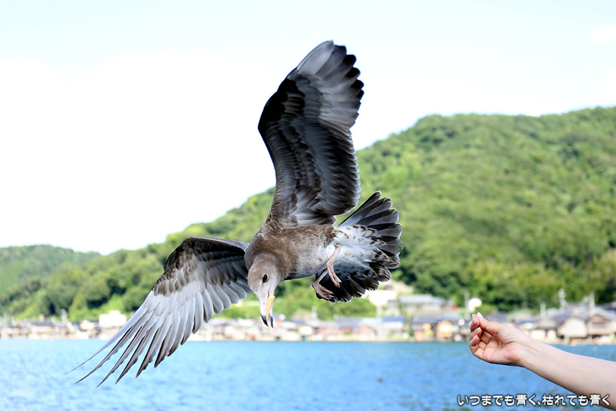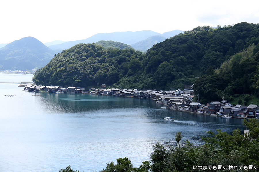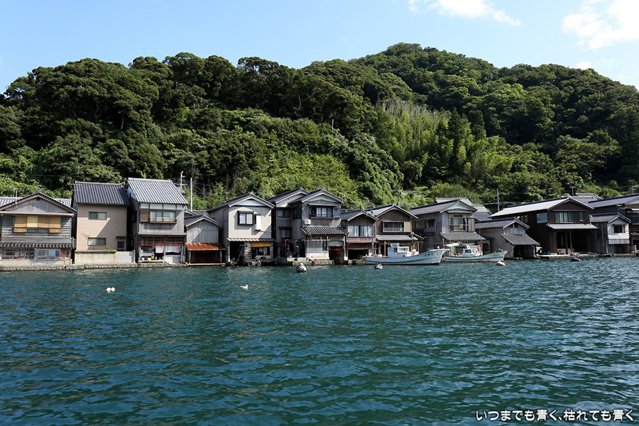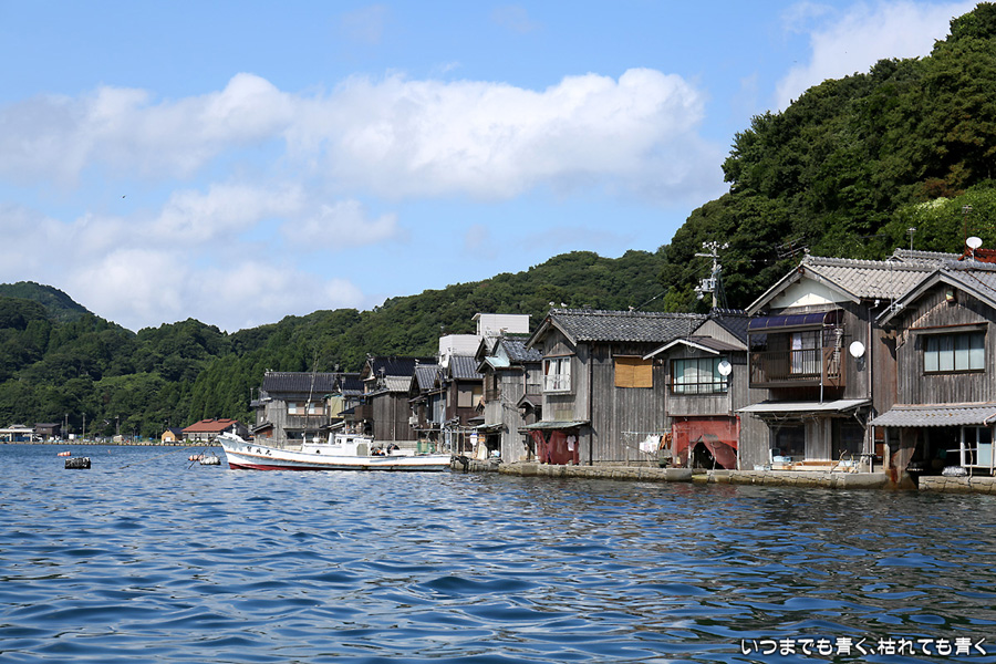 今回の旅でどうしても見たかった風景のひとつ、伊根の舟屋です。これだけの数の舟屋が並んでいる光景はここだけ。そのために、いろんなドラマのロケ地になった場所でもあります。奥の方まで舟屋が美しく連なっていて見ごたえがありますが、それを見るためには船が必須で、駐車場の近くにいろんな船の連絡先が書いてあります。今回は遊覧船ではなく海上タクシーを選んで頼みましたが、説明も楽しくて、要望にこたえて臨機応変に回ってくれてとても楽しめました。