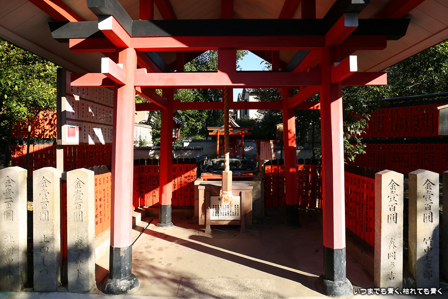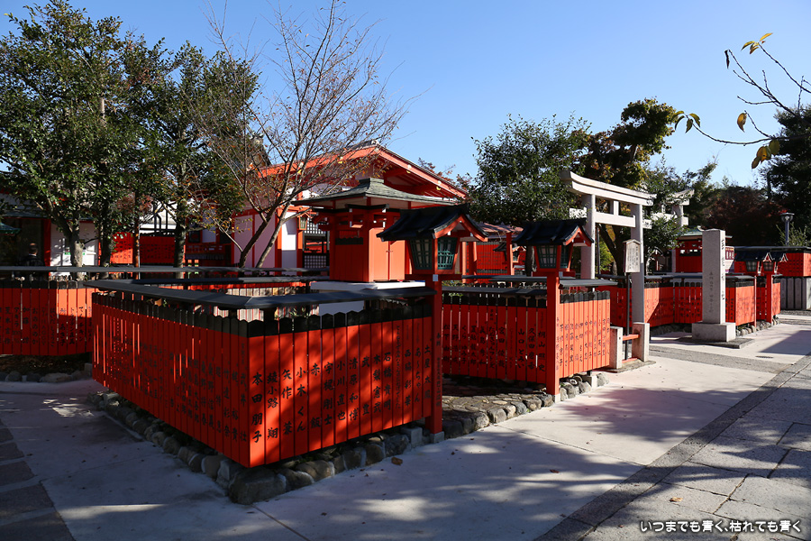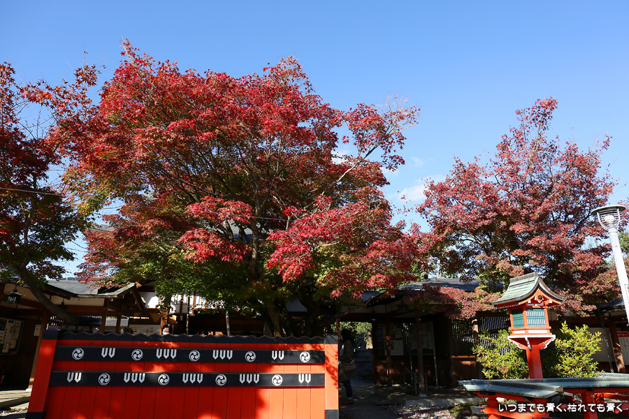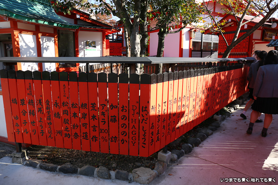 鹿王院の紅葉を見た後に歩いてやってきました。車折神社も今回は初めての参拝となります。車折神社には15の末社がありますが、その中でも最も有名なのは芸能神社です。有名人の名前が書かれた朱色の奉納板がずらりと並んでいるのが壮観です。紅葉は散ってしまっていたり青かったりしてあまりきれいではなかったので、紅葉の写真は諦めることにしました。帰りは車折神社の真ん前の駅から嵐電で嵐山まで戻りました。