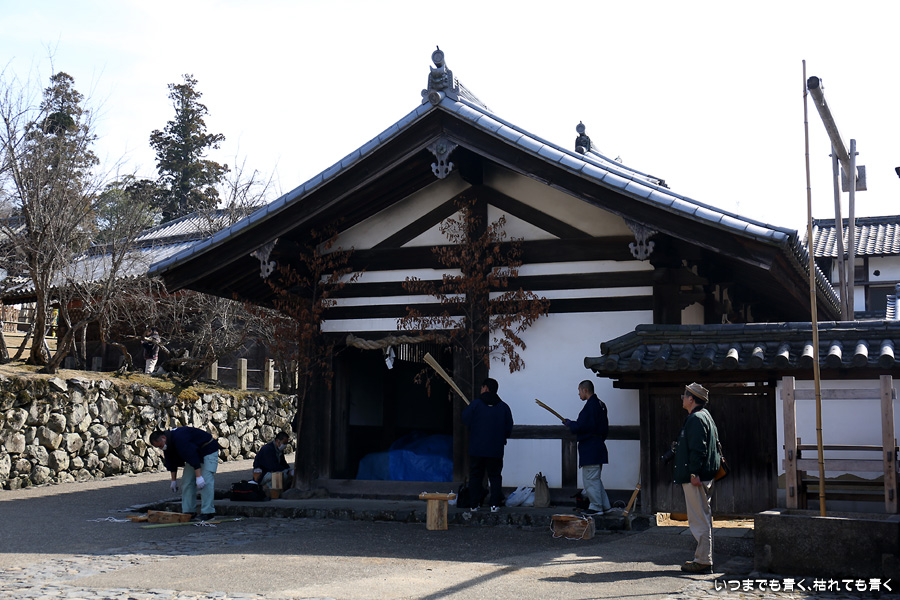 私の大好きなさだまさしの「修二会」を聴くたびに、頭の中でその世界を想像していました。修二会本行は3月1日から3月14日まで。この間は連夜、二月堂にお松明が走ります。いつかは見てみたいと思っていましたが、お水取りの日(3月12日)の大混雑は避けて、今夜を選んで出かることにしました。写真は、お松明の時刻を待つ昼間の二月堂の写真です。