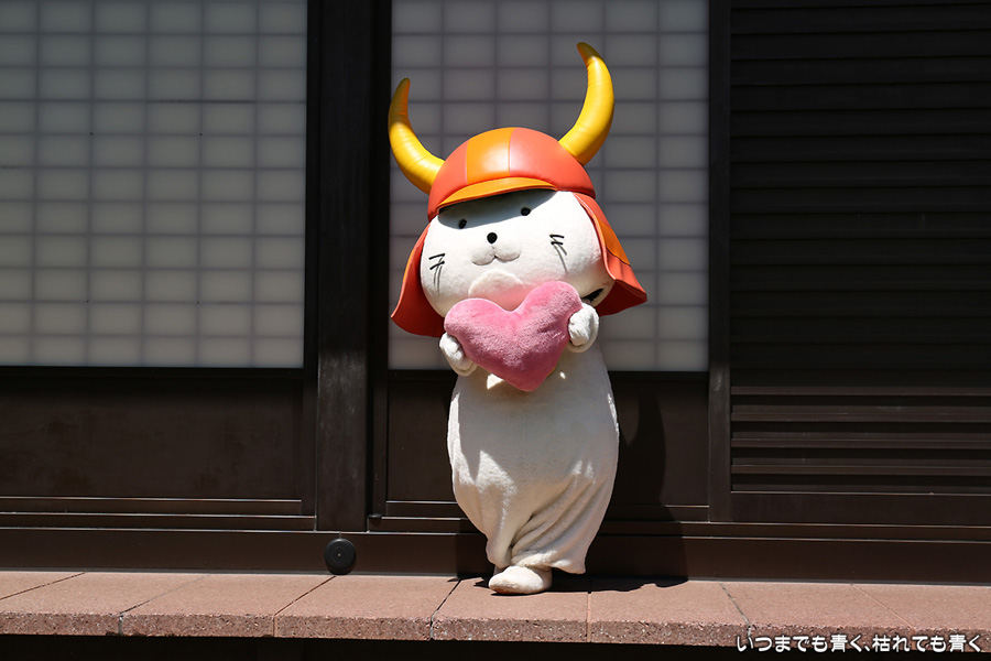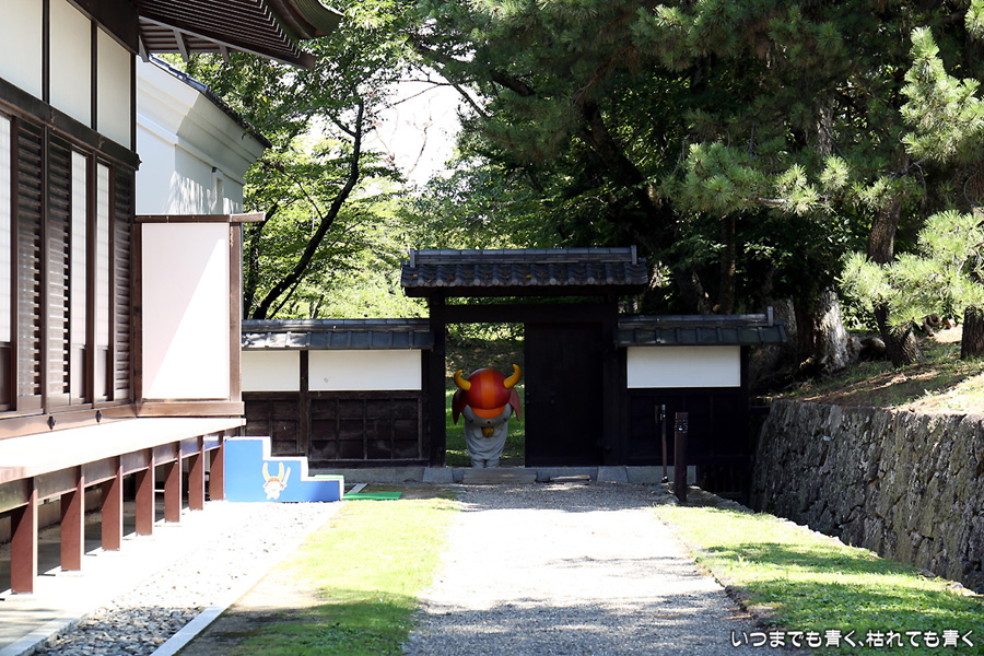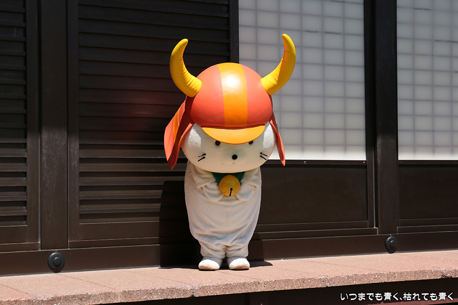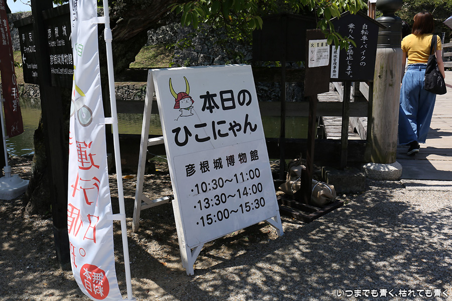彦根城は、私がクルマの免許をとったころ、両親を乗せてドライブに来たことがある場所です。小雨の中、時期でもない梅園を歩いた記憶がありますが、今となってはその記憶も正しいかどうか怪しいです。天守の残っている12城のうち、国宝は、松本城、犬山城、姫路城、松江城、そして彦根城の5城です。その中で訪れた記憶のあるのは、松本城、姫路城、そして今回の彦根城だけです。犬山城は近いにもかかわらず訪れたことはありません。彦根城は、本当に美しい城です。近くで見るとその美しさがよりよくわかります。彦根城は関ケ原のあと、石田三成の佐和山城を一掃するために家康の命により建てられた城で、当初は違う場所に建てる予定だったそうですが、井伊直政から直継の代になって、現在の位置になったと言われています。歴史は、本や教科書だけでは頭にはいらなくて、歴史の場所に来て、何がここであったかを思いめぐらせて初めて断片的な知識が糸になるような気がします。天守から見える小さな山も、あれが佐和山だとわかると、特別な山に見えてくるので不思議なものです。さて、彦根といえば、ひこにゃんですね。イラストよりも実物のほうがずっとかわいいです。動きが本当にゆるゆる。音楽も無くひこにゃんがゆっくりと動くだけなのですが、それがなんとも癒されます。暑い中、お疲れ様です。ちなみにひこにゃんは、ゲート前の博物館表御殿に登場するので、彦根城観覧料無しに見ることができます。その写真を最後に付けておきます。