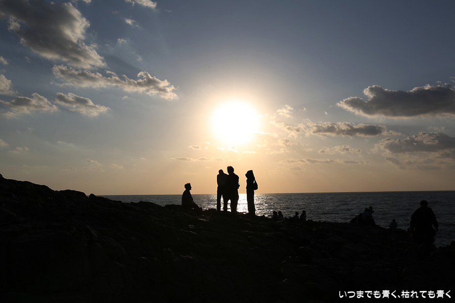 東尋坊では波が岩に打ちつけてちょっと荒々しい感じです。波が岩にあたって砕け散るさまを眺めているだけで、心は逆に落ち着いていくような気がします。落ちると危ないので端っこの方には行かないようにしていましたが、以前の心が病んでいた時にあった飛び込みたくなる衝動もなくて、のんびりと楽しむことができました。そうこうしているうちに、日本海に太陽が沈み始めて、あっという間にすべて見えなくなりました。沈んでいく夕日を見たのなんていつ以来でしょうか。天候にも恵まれ、贅沢なひとときでした。