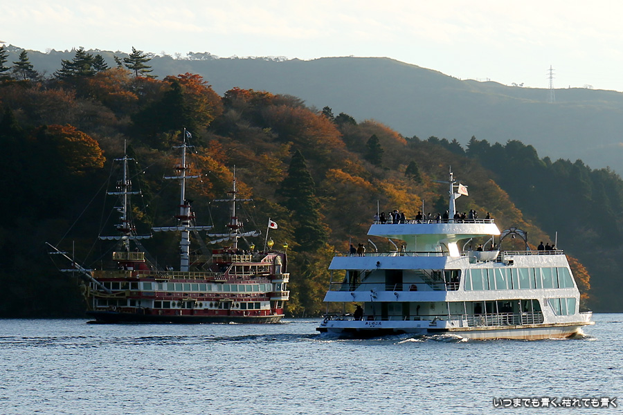 箱根神社に参拝したあと、芦ノ湖のほとりを巡り、のんびりと湖面と遊覧船と夕日を眺めていました。